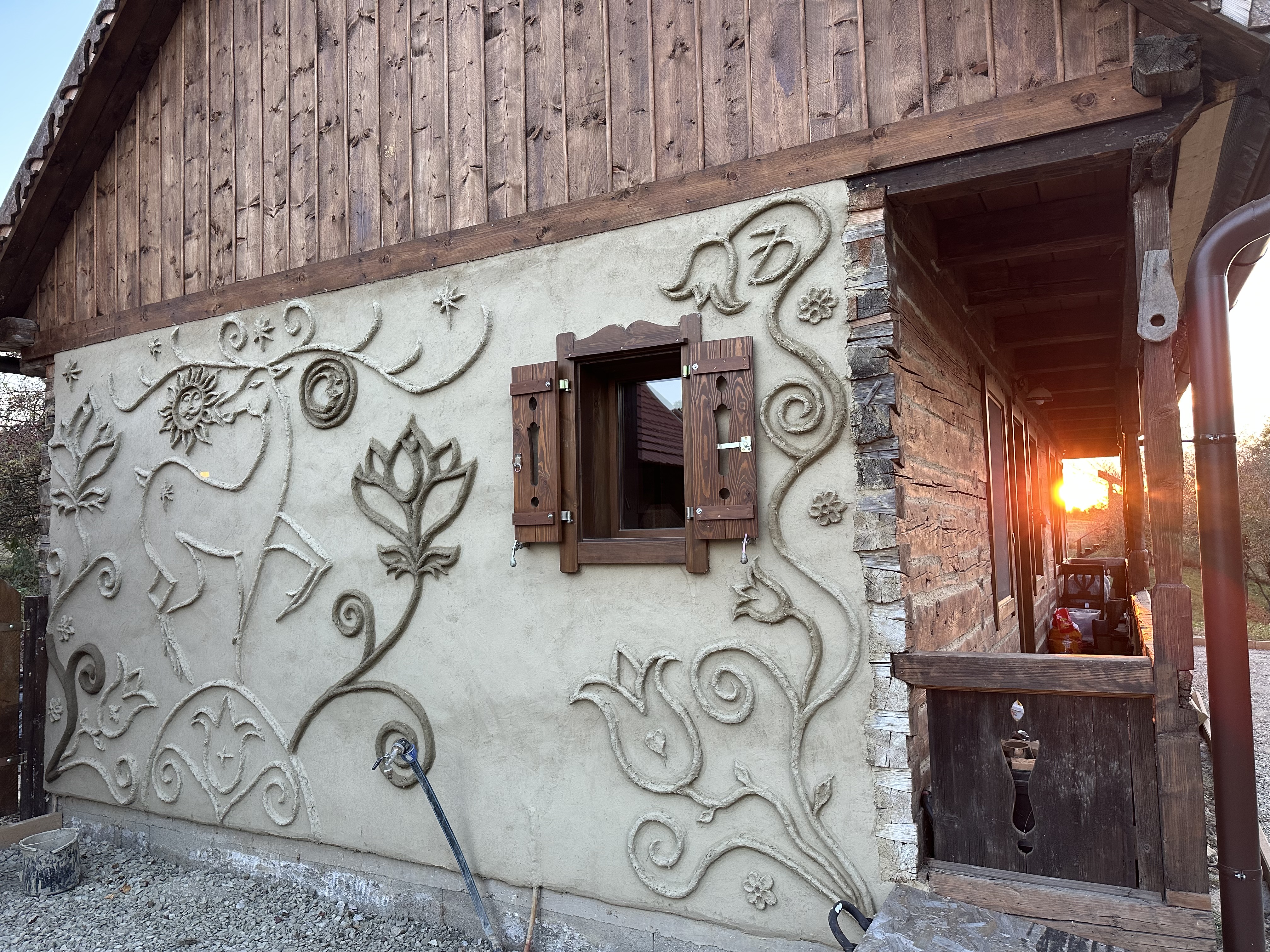 Nemrég fejeztem be a ház agyagos sárral történő tapasztását. A belső falakkal kész lettem már tavaly, három külső fal idén nyárra maradt, az elejét pedig nem fedtem el. Az épület eredetileg Gyergyóújfaluban állt. Abban a térségben különösen hideg volt mindig az időjárás, így ezeket a házakat kívül-belül tapasztották a jobb hőszigetelés érdekében. Azonban én szerettem volna, ha néhol látható marad a gyönyörű, régi, kézzel bárdolt faanyag, így a fronton a gerendákat lecsiszoltam, lenolajjal kezeltem, és csak a közüket töltöttem ki agyaghurkákkal. Hasonlóan jártam el a belső térelválasztó falakkal is. A többi falfelületre természetes anyagot simítottam több rétegben, és különböző ornamentikával díszítettem