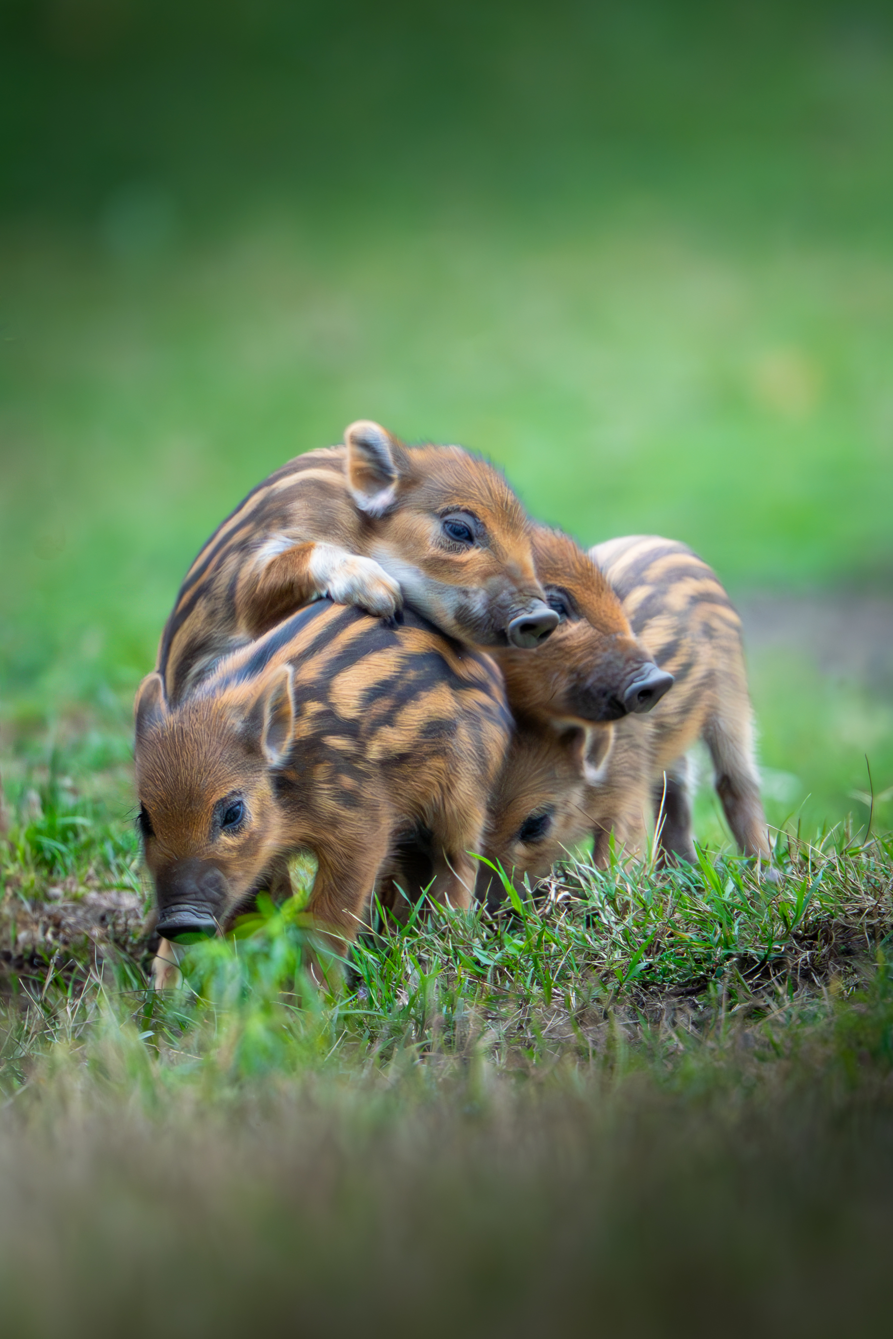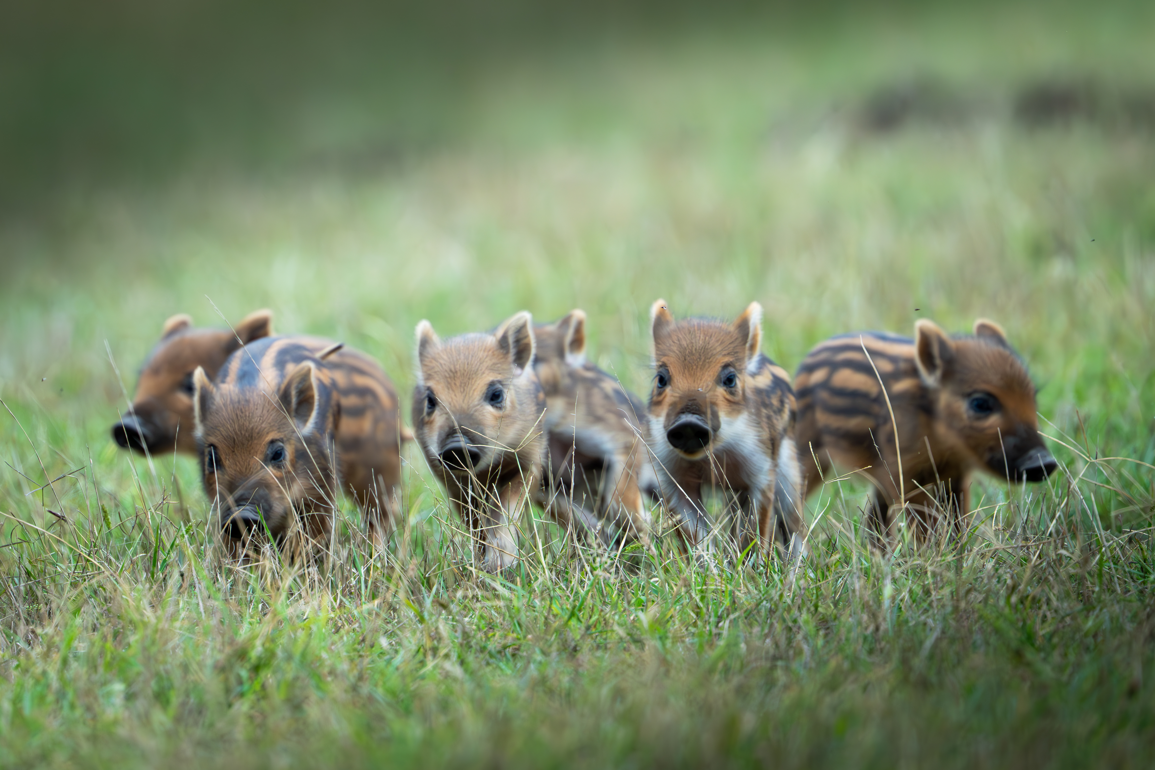 Egy mezőn voltam, és ott láttam meg a kismalacokat. Persze nem mentem közel, mintegy 30 méterre sátrat vertem, és vártam. Egy gödörben feküdtek a csíkos kis vadmalacok az anyjukkal. Körülbelül négy órát kellett várnom, mire a koca felkelt és el kezdett mászkálni. Bő negyven percig nagyon messze voltak, aztán elindultak a fotós sátram felé. Így egészen közelről tudtam felvételeket készíteni a családról, majd annyira közel jöttek, hogy ismét csak a telefon maradt. Alig három méterre voltak a lessátortól, ami már túl közel volt a teleobjektívnek
