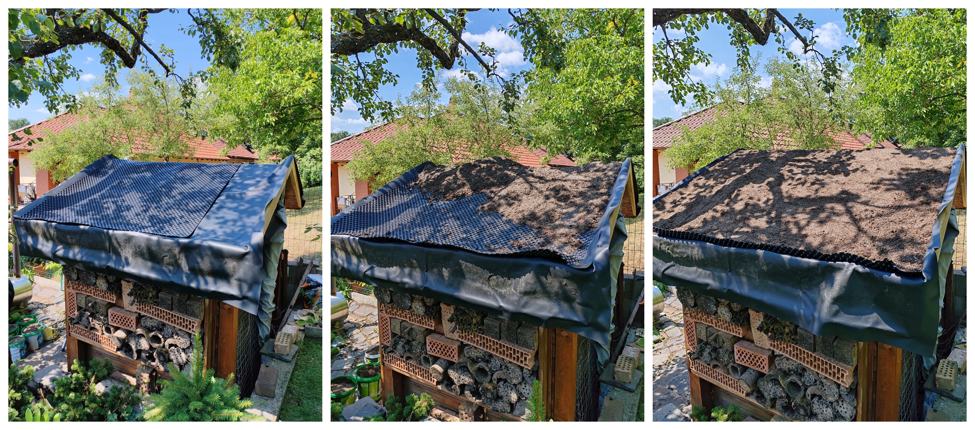Ha már cseréltük a pozdorja tetőt, kapott egy teherbíróbb, 3 centiméter vastag OSB lapot. Ezután készült el a tíz centis deszkából szerkesztett keret, ami a termőközeget célzott megtartani. Fontos tényező a teherbíróbb felület, amelyet a vízszigetelés előtt rovarölő (hangyairtó) szerrel szórtam be. Maga a vízszigetelés PVC tófóliával készült, erre került a dörken lemez, mely némi vízvisszatartási és termőközeg stabilitási funkciója miatt került fel. A talajkeveréket saját kezűleg állítottam össze, zsákos (tőzeges) virágföld és folyami homok 4:2 arányban történt összekeverésével