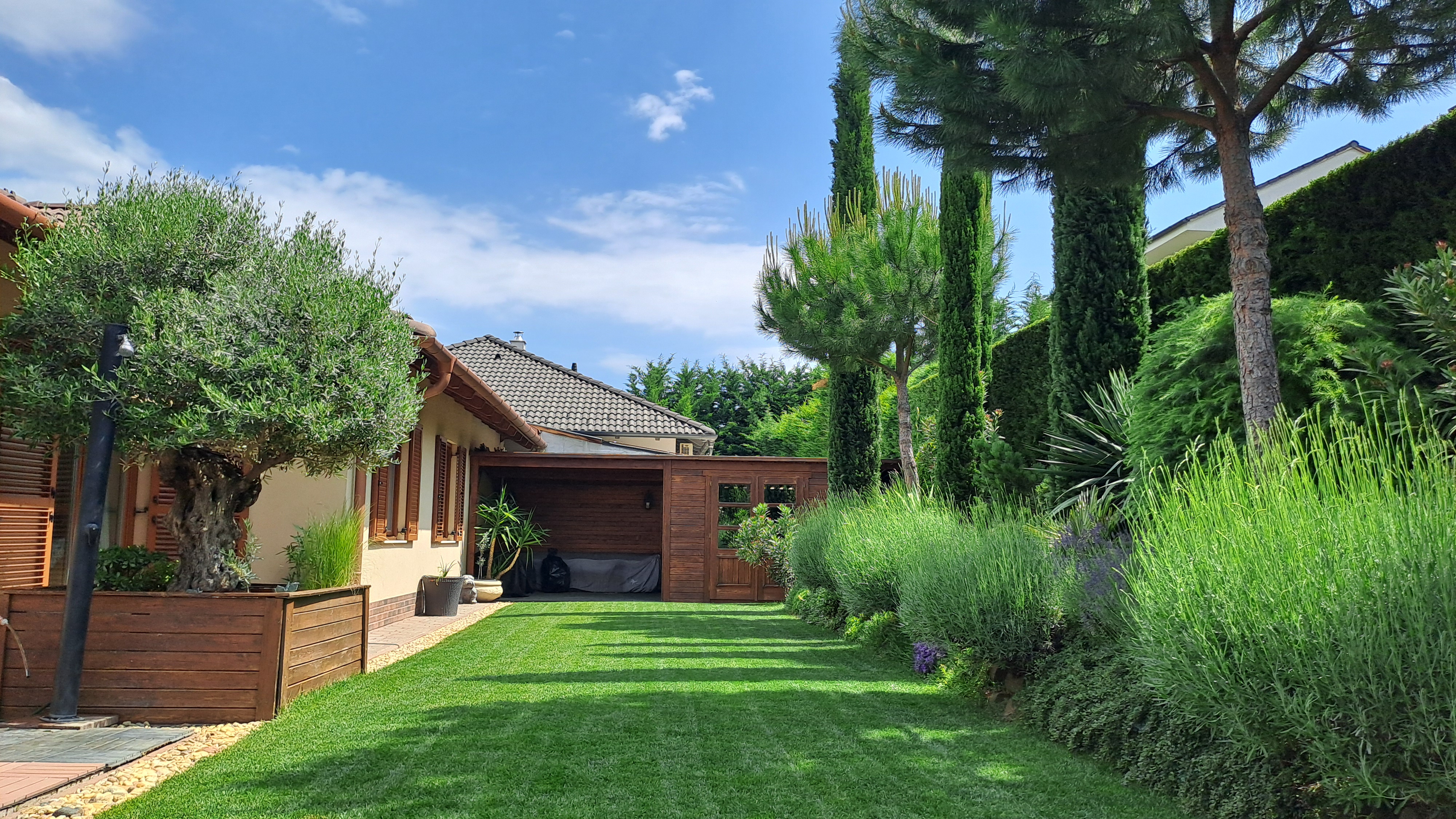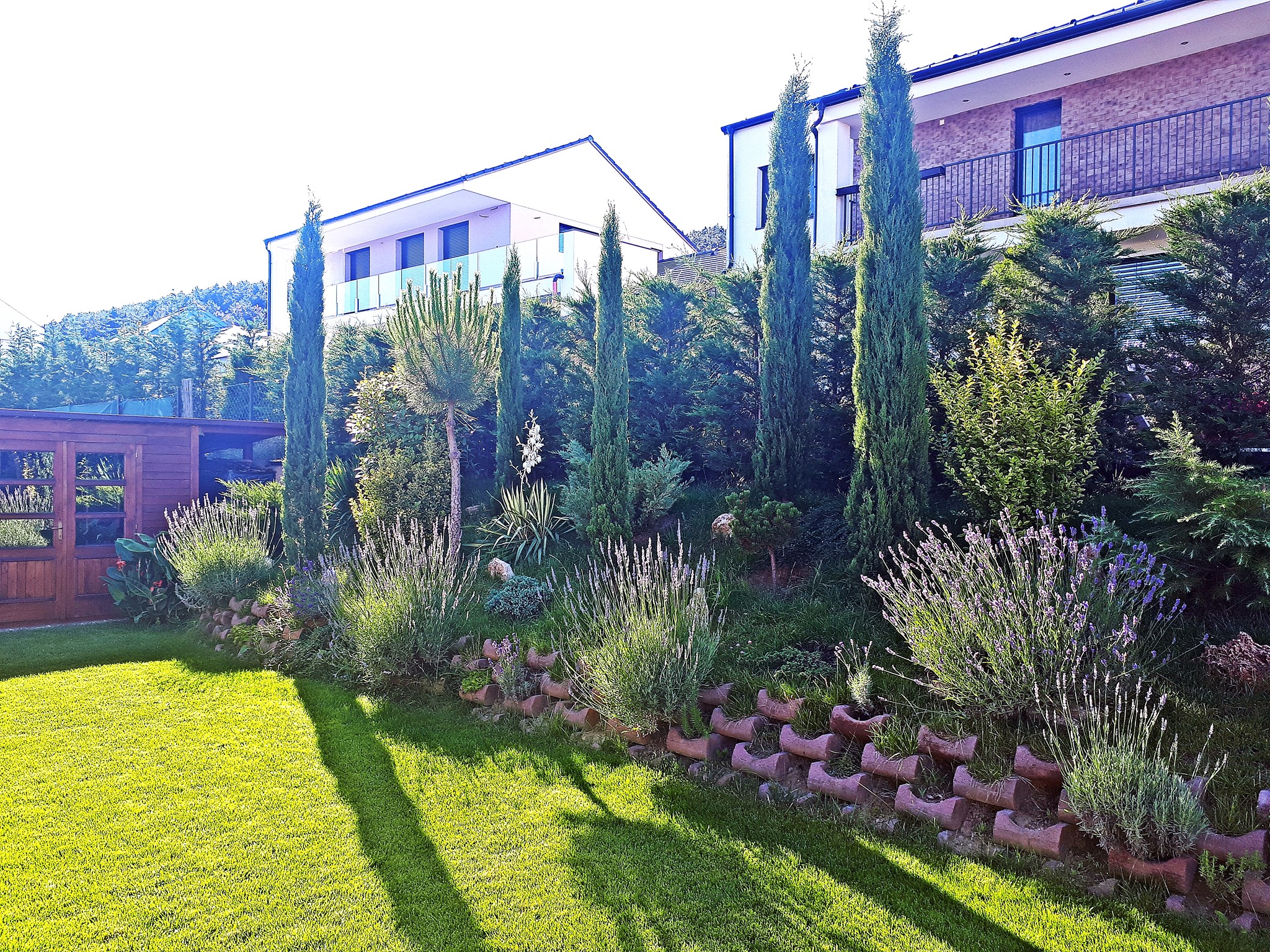 Az ürömi kertben a gyep is mediterrán magkeverék (Toscana). Kicsit vastagabb szálú állományt jelent egy réti vagy angol perjéhez képest, cserébe igen strapabíró, tömör és betegségeknek jól ellenálló.