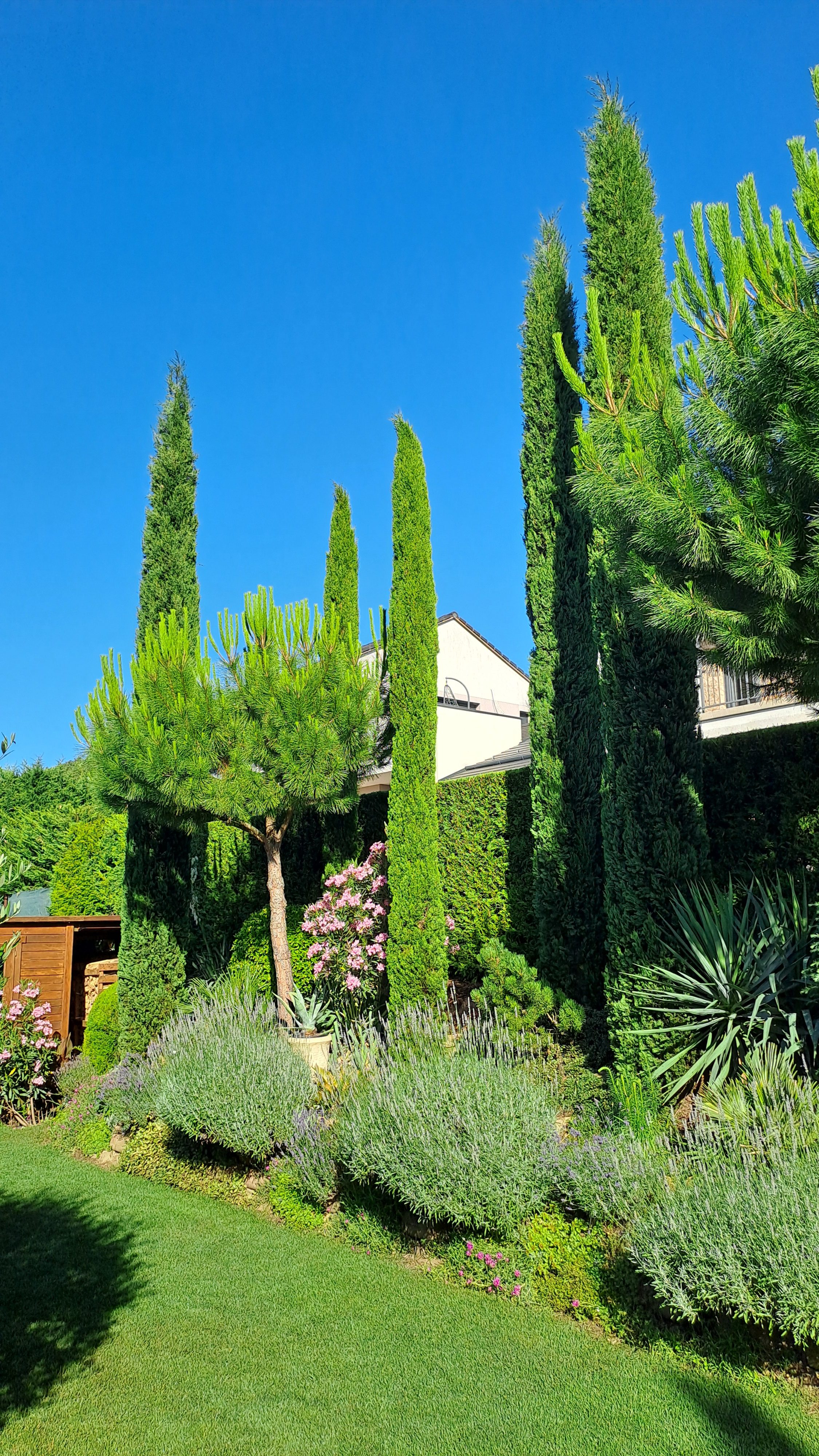 Az a koncepcióm, hogy 10-15 éves időtávlatban a mandulafenyők törzsmagasságát folyamatosan növelve idővel a ciprusok felé nőnek és ott tudják majd elnyerni az időskori ernyőszerű formájukat. 8 év elteltével a ciprusok 7 méter felett járnak, ezt a magasságot valószínű metszéssel már megtartom, legalábbis amíg a fenyők nem hagyják le őket