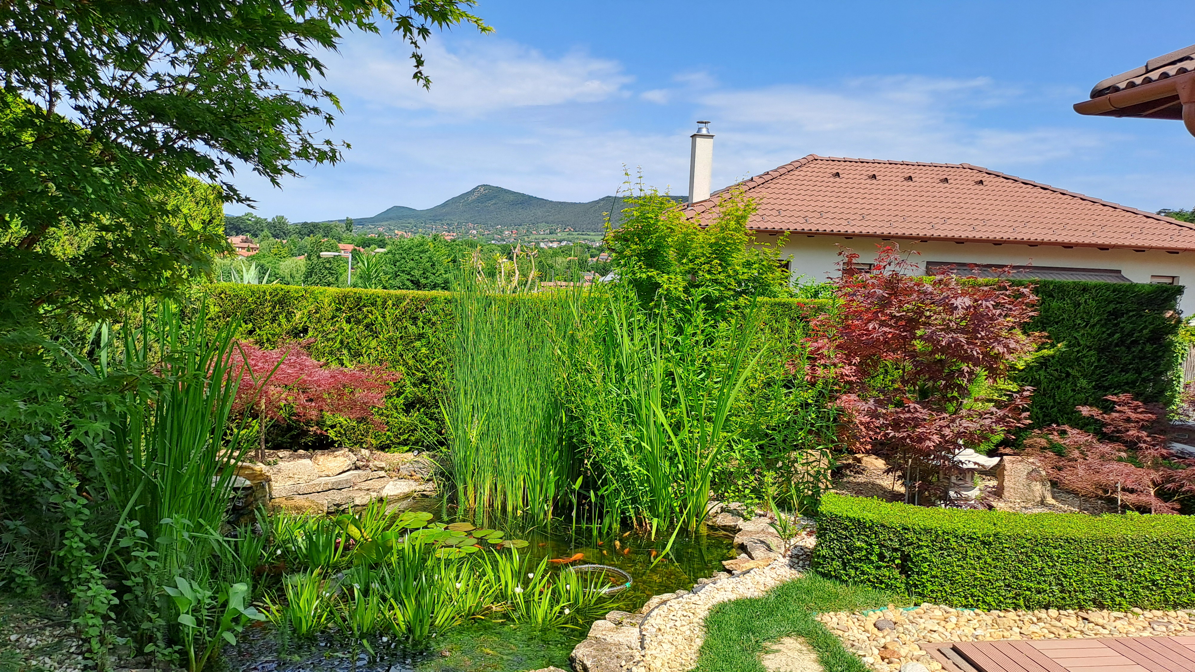 András a kertük egy másik részén egy kis tavat is kialakított, és több mint 10 féle japán juhart is ültetett. Első hallásra a mediterrán kert és a japán juhar ellentmondásosnak tűnik, de a Comói-tónál több kert is ékes bizonyítéka, hogy igenis jól beilleszthetők ezek a fák is és változékony lombszínükkel fel tudják dobni az egyébként sok zöldet.