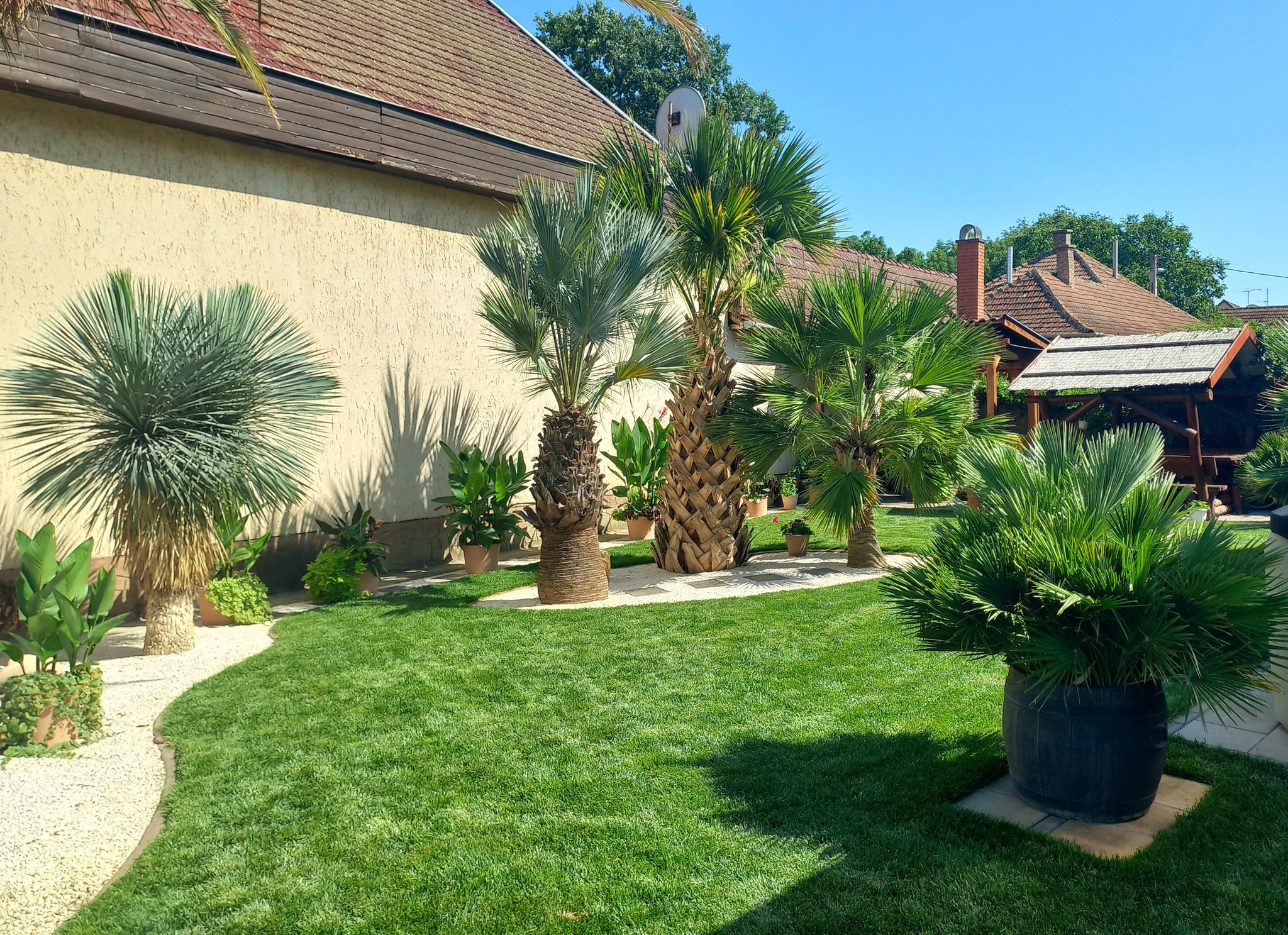 Bár a pálmák a kert főszereplői, Norbert felesége a virágos részt odaadással gondozza, ahol kánák, hortenziák és illatos leanderek pompáznak. A portán belül 125 négyzetméter a füves terület, az utcafronton pedig hat kínai kenderpálma és tizenegy Yucca rostrata fogadja a járókelőket. Norbert kertje élő bizonyíték arra, hogy kitartó munkával és szenvedéllyel a mediterrán álom Magyarországon is valóra válhat.