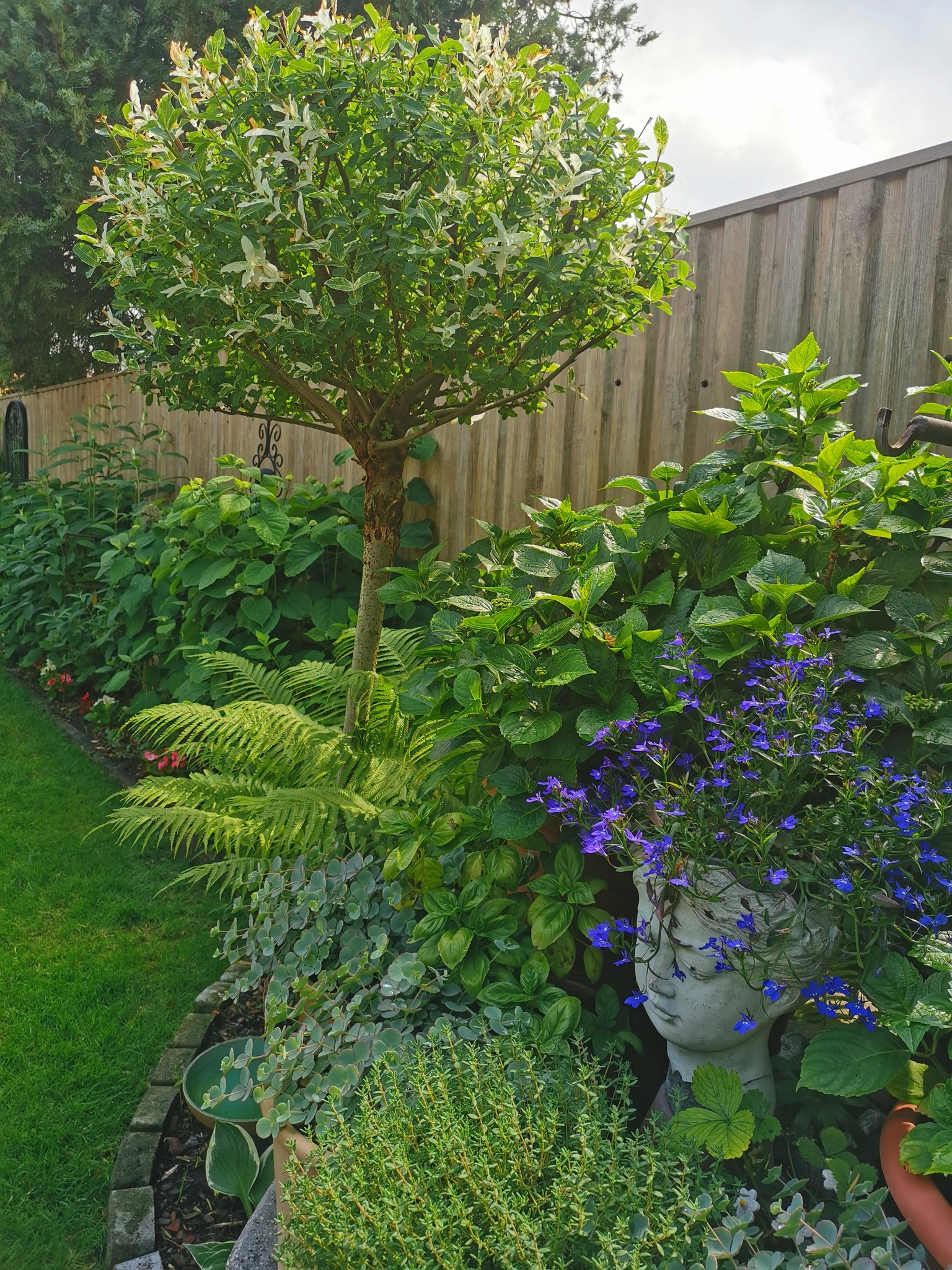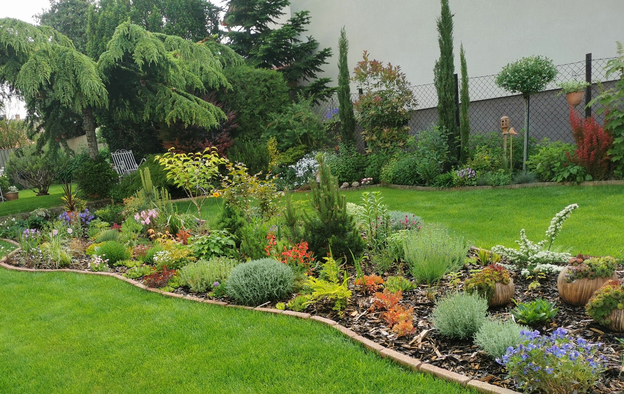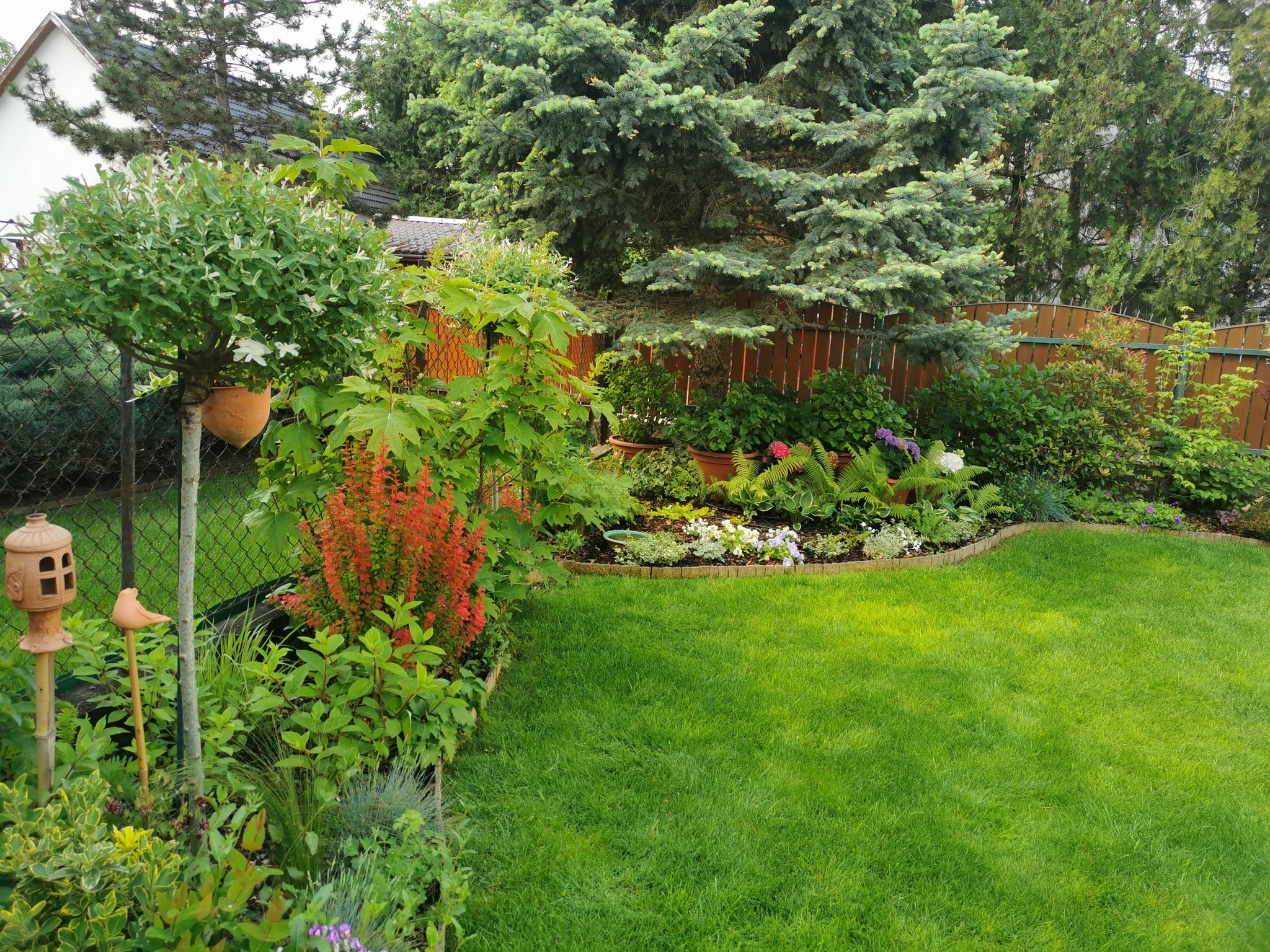 A kertépítés fokozatosan haladt, főként a ház felújítása után, kezdetben inkább a fű uralta a teret. A nagyobb átalakulás az elmúlt tíz évben történt, amikor Mária nyugdíjba vonult. Először a kerítés mellé kerültek ágyások és sziklakert, majd jött a himalája cédrus, amely azóta is a kert büszkesége.