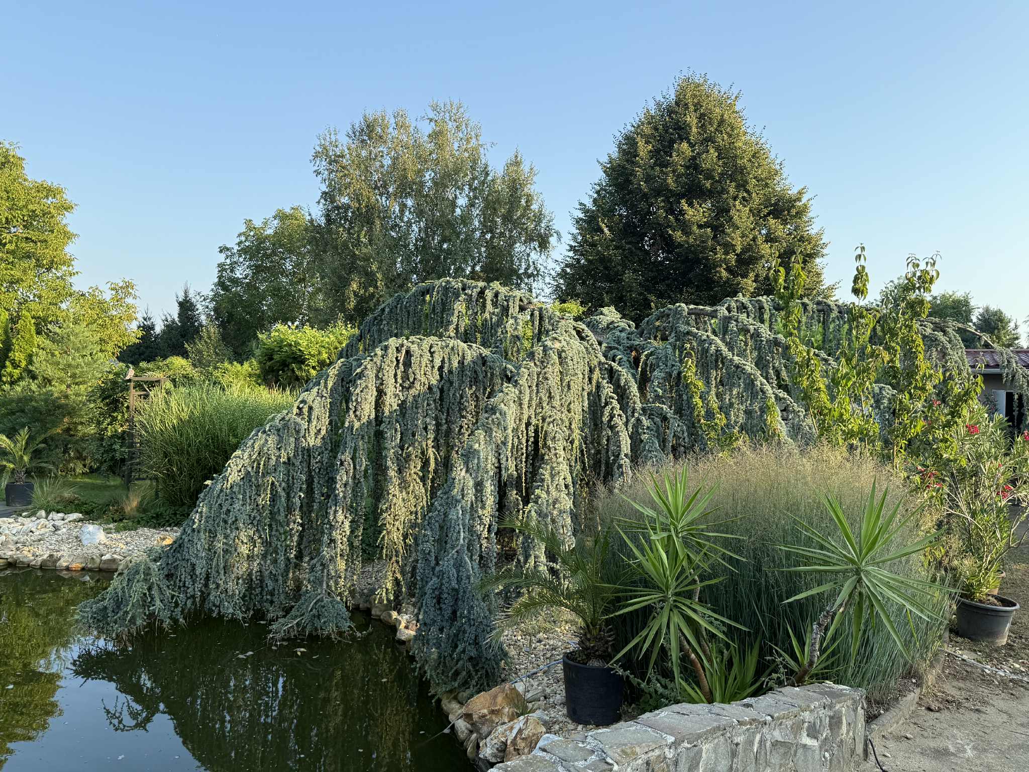 Az atlasz cédrusnak van egy kis története: amikor cédrus vásárlásra adtuk a fejünket, a férjem választotta a himalájait én pedig az atlasz cédrushoz ragaszkodtam. A férjem azt mondta, hogy ne vegyük meg az atlasz cédrust, mert úgy néz ki, mint a „pecabot”. Valóban, akkor, 15 évvel ezelőtt egy nagyon kis vékonyka szárú, két vagy hám ágból álló fa volt ő, ma viszont a kert egyik kiemelkedő éke.