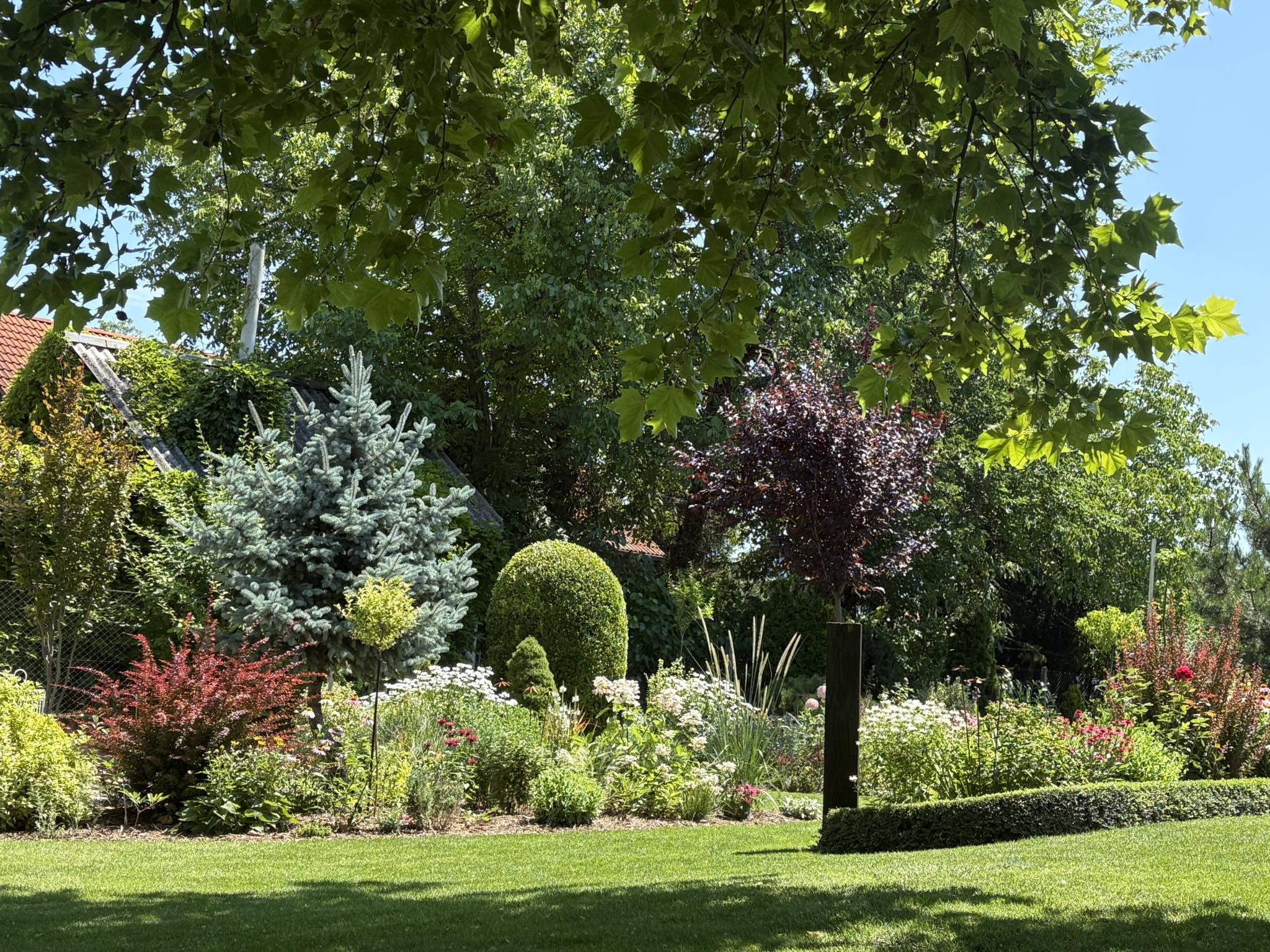 A kertészkedés számomra hosszú ideig csak hobbiként létezett – lelki feltöltődésként, ami egyensúlyt teremtett a mindennapi munkám mellett. Most jött az életemben egy fordulat. Mivel otthon szeretnék pedagógiai tevékenységgel foglalkozni, támadt egy ötletem, hogy egyúttal megnyitom a látogatók előtt a kertem kapuit is. Bár egy forgalmas út közelében található, mégis a vidéki környezet, egy kis vízfolyás és egy akácerdő ölelésében. A formára nyírt növények rózsákkal, virágzó évelőkkel és ívelt ágyásokkal váltakoznak, így angol vidéki kert hangulatát idézik.