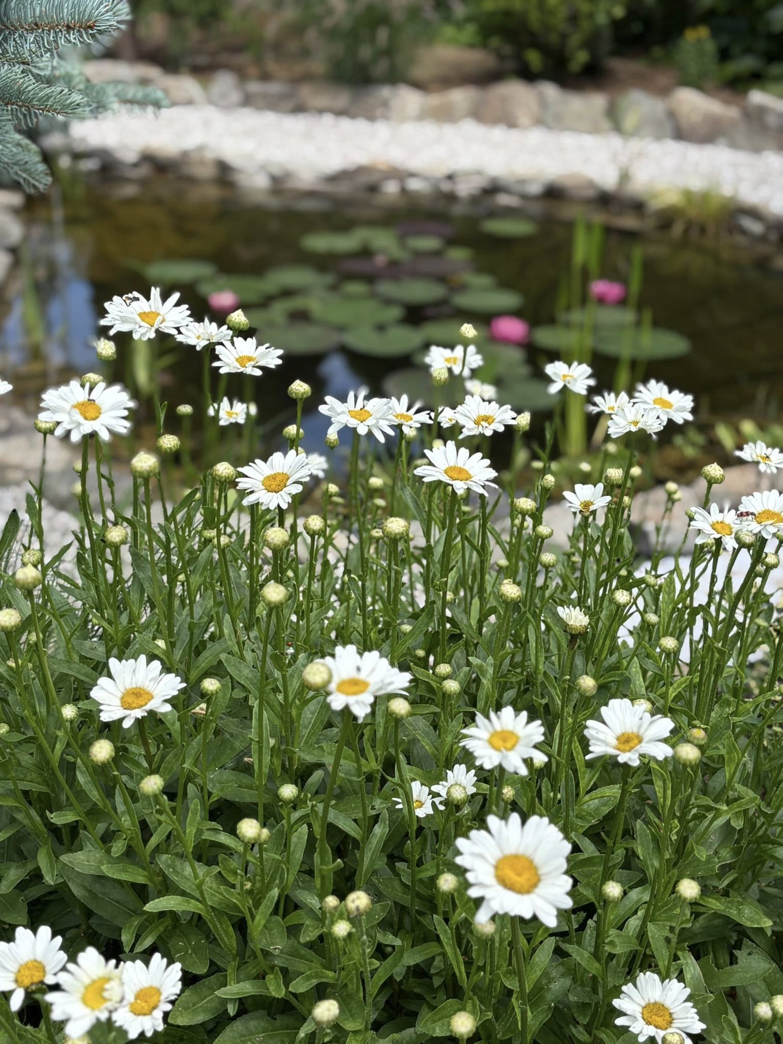 Leginkább esztétikai értéket vártam a tavacskától. Úgy alakítottam, hogy minden oldalról hozzáférjek a vízinövényekhez, és egy előre megtervezett lépcsőn le is tudjak menni, hogy a tavirózsákat és az iszapot gondozzam. A szélek vízszintesen futnak, így helyet adnak a mocsári és parti növényeknek, a falak többi része viszont lejt, hogy az üledék a legmélyebb pontra gyűljön. A legmélyebb zóna 1,1 méteres, így a halak át tudják vészelni a telet, nyáron pedig ne melegedik túl a víz. Úgy helyeztem el, hogy a tavirózsáknak elegendő napfény jusson a virágzáshoz, de a platán délutáni árnyéka is elérje a sekélyebb részt, mielőtt túlmelegedne.