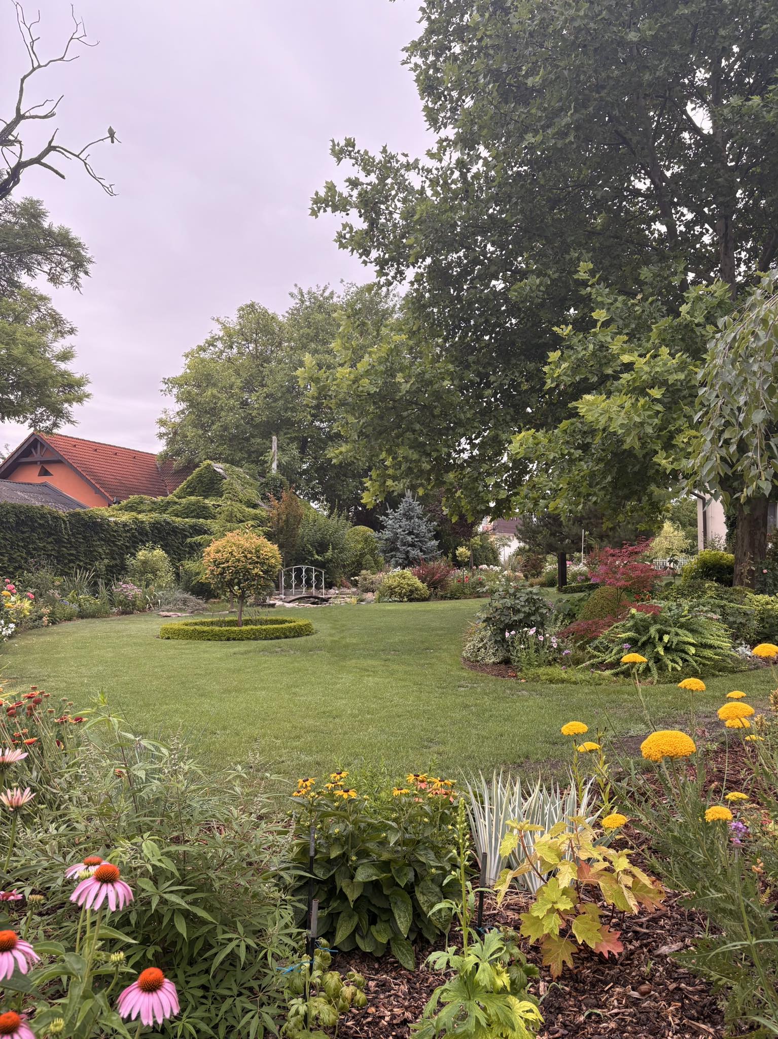 A kertészkedés számomra hosszú ideig csak hobbiként létezett – lelki feltöltődésként, ami egyensúlyt teremtett a mindennapi munkám mellett. Most jött az életemben egy fordulat. Mivel otthon szeretnék pedagógiai tevékenységgel foglalkozni, támadt egy ötletem, hogy egyúttal megnyitom a látogatók előtt a kertem kapuit is. Bár egy forgalmas út közelében található, mégis a vidéki környezet, egy kis vízfolyás és egy akácerdő ölelésében. A formára nyírt növények rózsákkal, virágzó évelőkkel és ívelt ágyásokkal váltakoznak, így angol vidéki kert hangulatát idézik.