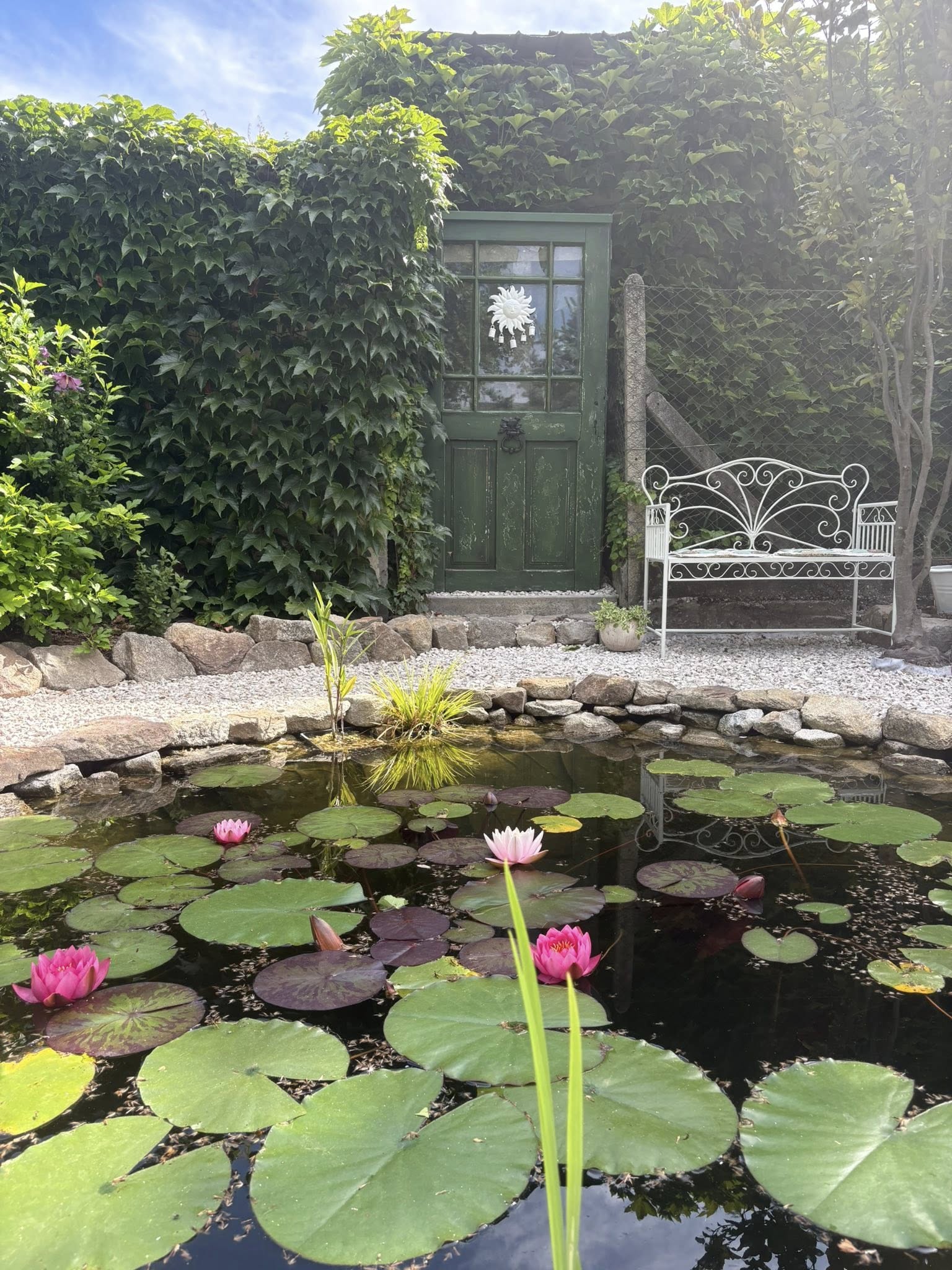 Leginkább esztétikai értéket vártam a tavacskától. Úgy alakítottam, hogy minden oldalról hozzáférjek a vízinövényekhez, és egy előre megtervezett lépcsőn le is tudjak menni, hogy a tavirózsákat és az iszapot gondozzam. A szélek vízszintesen futnak, így helyet adnak a mocsári és parti növényeknek, a falak többi része viszont lejt, hogy az üledék a legmélyebb pontra gyűljön. A legmélyebb zóna 1,1 méteres, így a halak át tudják vészelni a telet, nyáron pedig ne melegedik túl a víz. Úgy helyeztem el, hogy a tavirózsáknak elegendő napfény jusson a virágzáshoz, de a platán délutáni árnyéka is elérje a sekélyebb részt, mielőtt túlmelegedne.