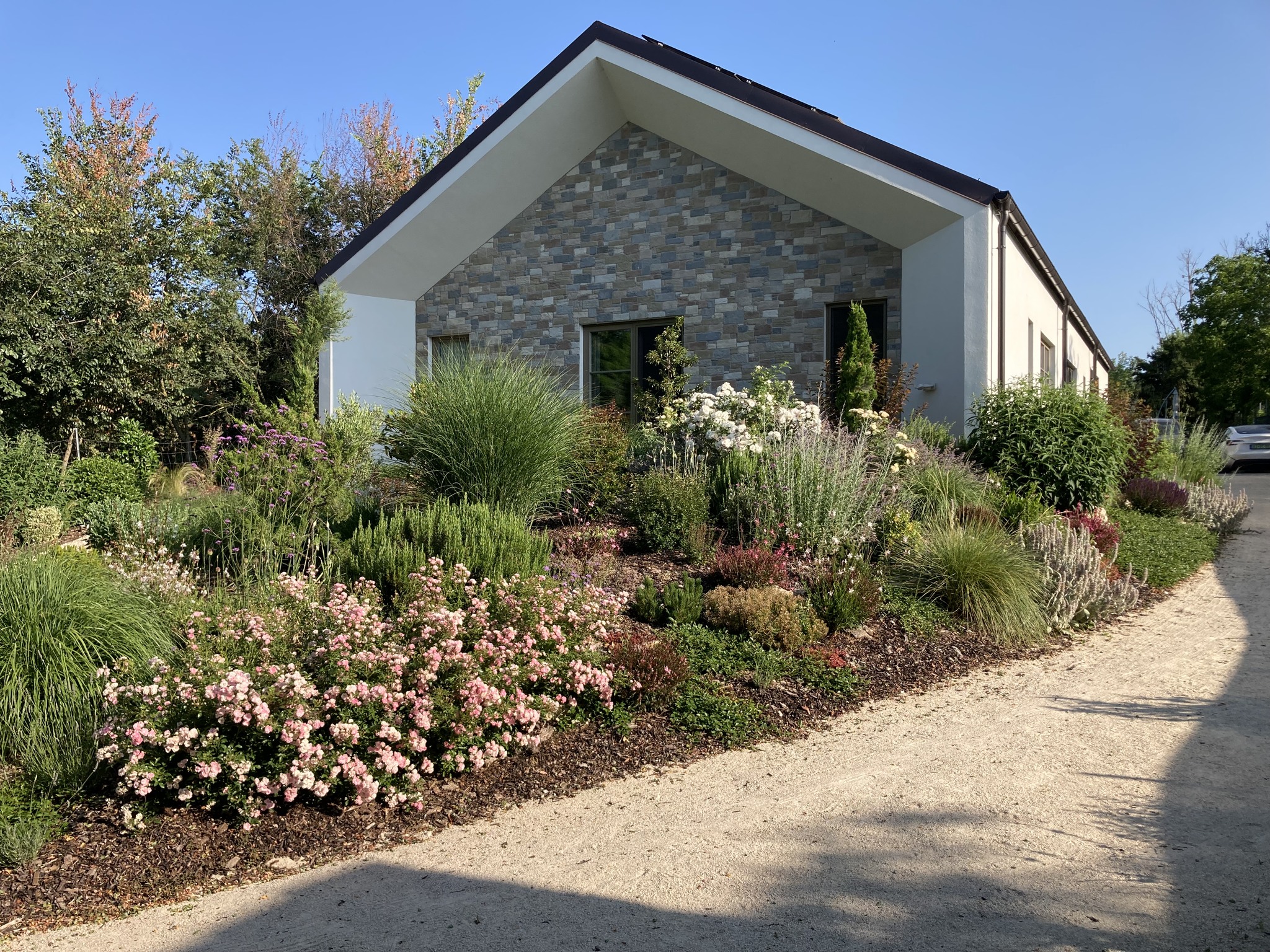 Az épület szervesen kapcsolódik a külső környezetéhez, amit folyamatosan építek, alakítok. Aprólékos, intenzív munka sok-sok tanulással. Itt is fő szempont volt a takarékos, környezettudatos alkotás. Minimális a szilárdburkolat – csak a telek erősen emelkedő első részén, az autóbeállók, illetve az épület nyugati oldalán van járda, valamint egy 70 centiméter magas kis támfal a szomszéd felől, ami elkerülhetetlen volt ahhoz, hogy megtartsuk az akadálymentességet ezen a lejtős területen. Ami eső itt leesik, az itt is marad, de nem gyűjtjük, mert nagyon nehéz a mostani időjárásra jól méretezni egy esővíztárolót. A tetőről a vizet az épület melletti növények kapják szivárogtatva. A kert kialakításánál fő szempont volt, hogy öntözésmentes legyen, azaz, igyekeztem olyan növényeket ültetni, melyek bírják a szárazságot. Ezt megfelelő talajtakarással és sűrűbb ültetéssel tudom segíteni azáltal, hogy csökkentem a talaj nedvességének gyors párolgását. A kezdeti friss ültetések kapnak vizet, ez elkerülhetetlen, de ha megszokták a helyüket, akkor már nem. Így ugyan lassabban nőnek, de gyökérzetükkel keresik a vizet, nem szoknak hozzá, hogy jön az öntözőből. Ez egy kísérlet is egyben, de mellé kapnak sok-sok szeretetet. A kert 2000 négyzetméter, aminek a végében egy fás, ligetes méhlegelő lett kialakítva, előtte pedig készülnek az évelőágyások bokrokkal, belecsempészve gyümölcsfákat, fügét, málna-, ribizli- és szederbokrot. Csak a terasz mellett van egy kis füves terület, ami a terasz megnagyobbítása. A mi panorámánk a saját kertünk (lesz), minden szegletét nagyon szeretjük már most.”