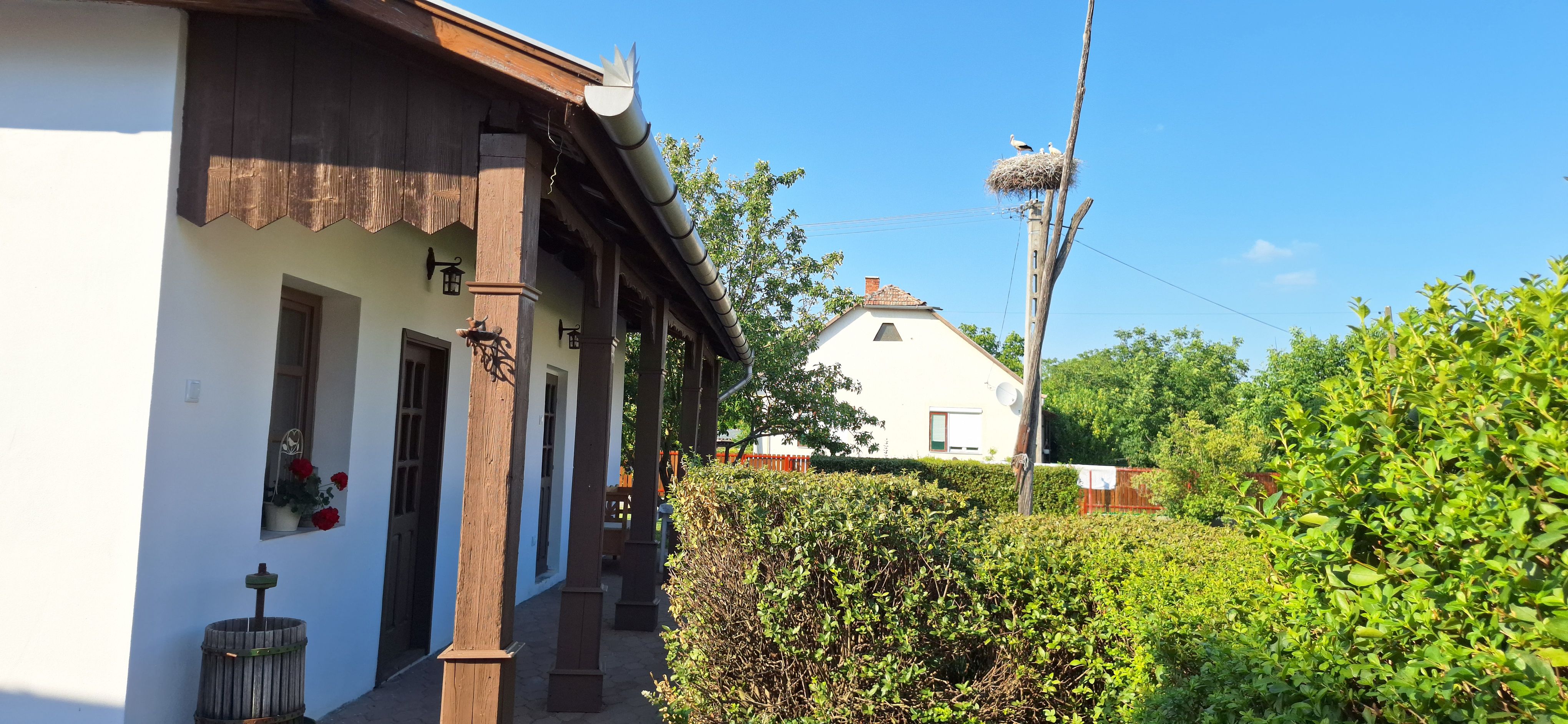 Kivételes élmény az állatokat kedvelő vendégeinknek, hogy egész nap figyelhetik Kelenéket, akik bizony a kertbe is leszállnak gilisztázni, pockot fogni. Kitettünk nekik egy itató kádat is, amit a nyári melegben rendszeresen használnak. A tematika tehát adott volt. A vendégeinket például egy kis gólyás könyvtár, távcső és játékok is várják a házban.