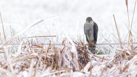 A hímek inkább kisebb madarakat – cinegéket, pintyféléket, verebeket – zsákmányolnak -, a tojók pedig rigóféléket, seregélyeket, de akár galambokat, balkáni gerléket is.