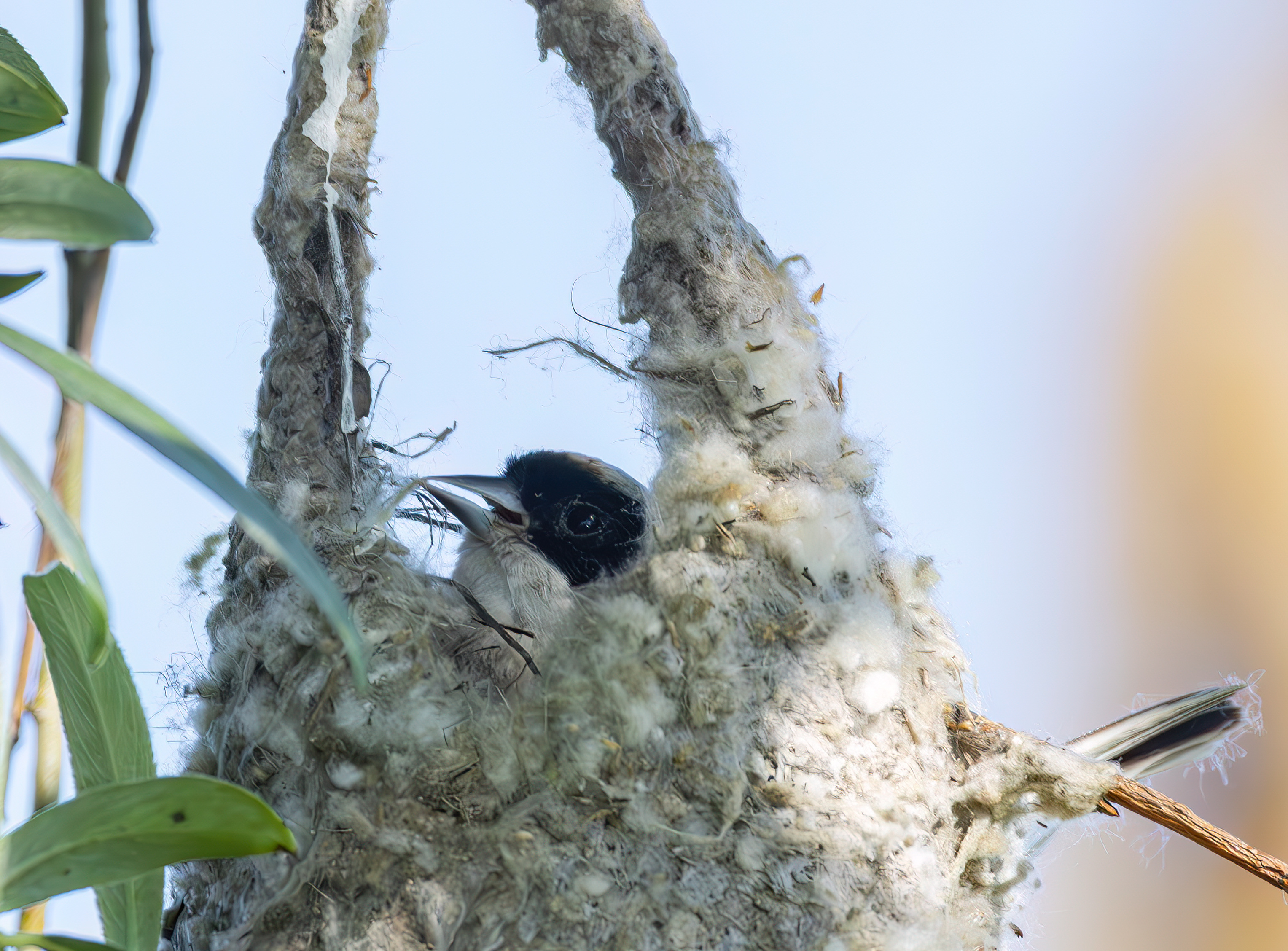 A nádbugáját előszeretettel használja építő elemként, a fészke építésénél. Általában az ágak villás elágazásánál kezdi az alkotást, nem egyszer mindketten szorgoskodnak, de jellemzően azért inkább a hím a kezdeményező. A fészek akkor van kész, ha bejárat is elkészült, ami jellemzően egy kicsit kiáll és lefelé néz, hogy az eső ne tudjon beesni. Az is jellemző rá, hogy sokszor a tavalyi mellé építi fel az újat, ahogy ez egyik fotón látható is. Még azt is megfigyeltem, etetéskor a szülők sok pókot hoznak a fiókáknak