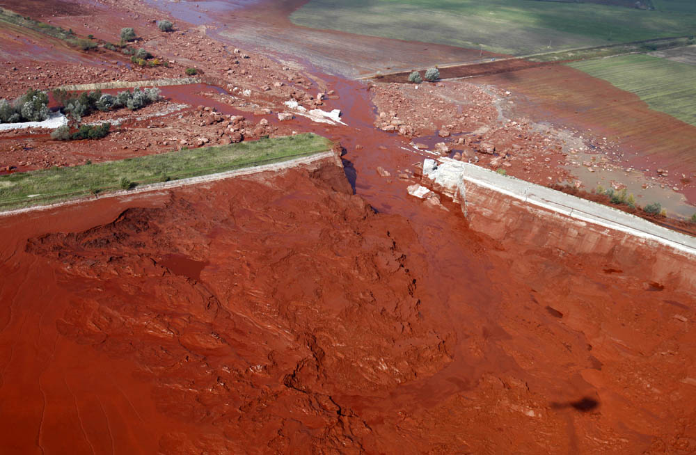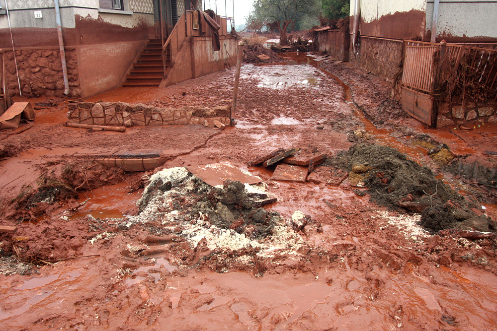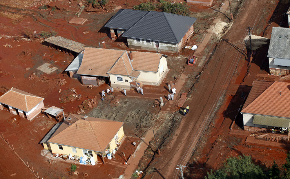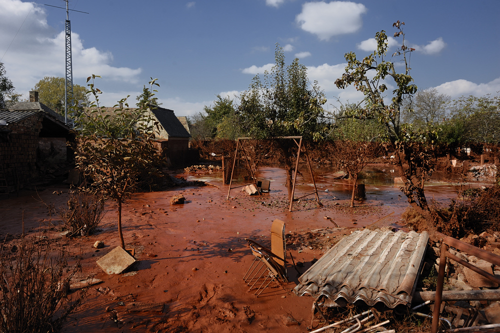 A vörösiszap-katasztrófa során kiömlő több mint egymillió köbméternyi, lúgos, maró ipari hulladék 40 négyzetkilométeren öntötte el a vidéket, és alig egyetlen óra alatt rombolt le házakat, és tett tönkre életeket Devecserben, Kolontáron és Somlóvásárhelyen.