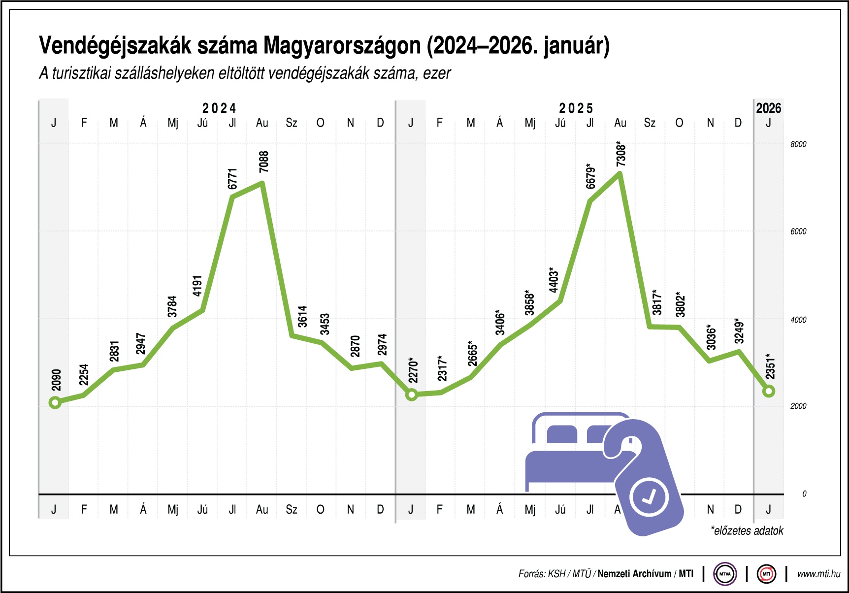 2026 januárjában a turisztikai (kereskedelmi, magán- és egyéb) szálláshelyeken közel 1,1 millió vendég mintegy 2,4 millió vendégéjszakát töltött el. A vendégek száma 5,3, a vendégéjszakáké 3,6 százalékkal nagyobb volt az egy évvel korábbinál