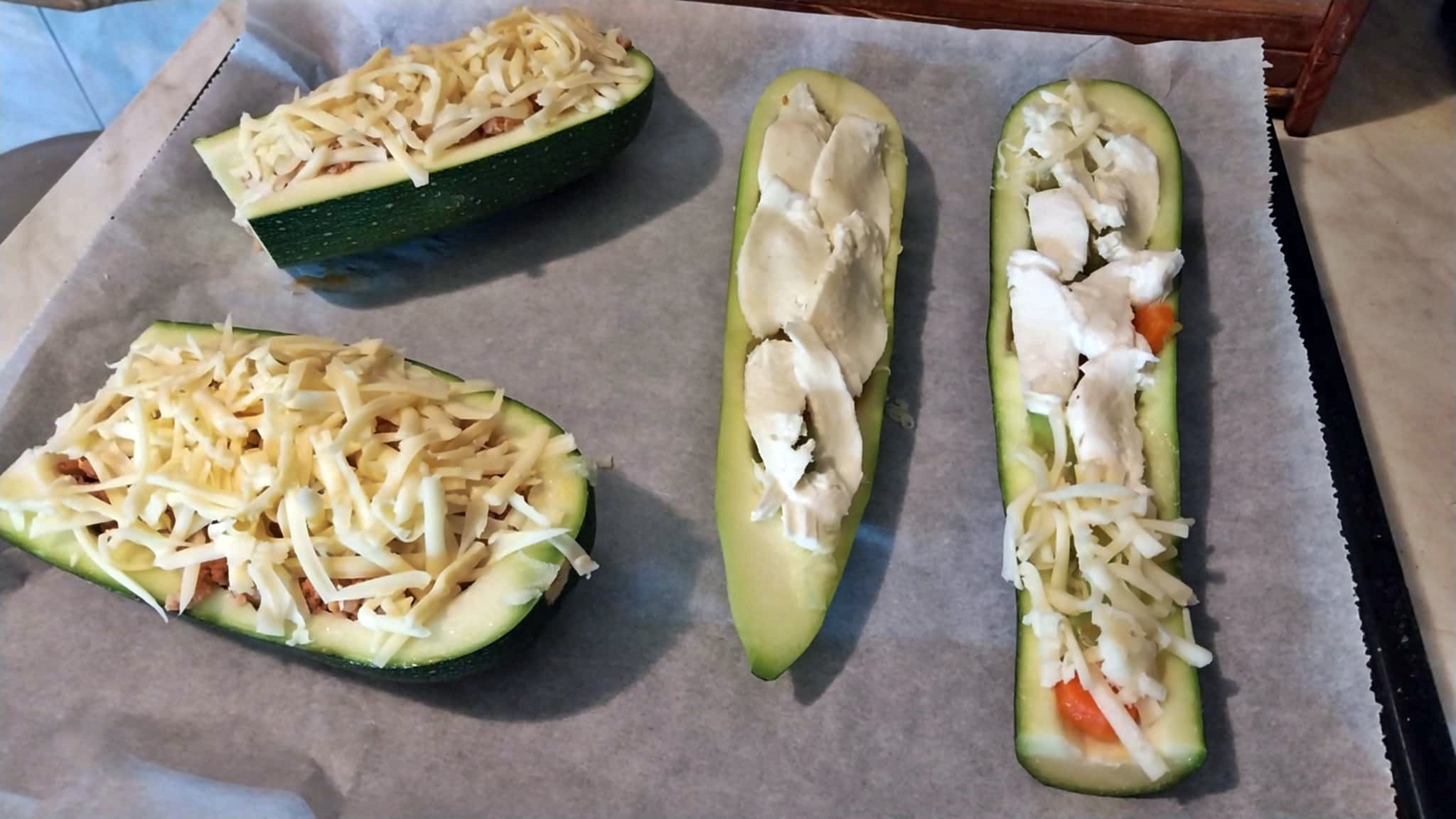 A cukkínik közepét kivájjuk, meg is pucolhatjuk, én így tettem az egyikkel, mert van a családban, akinek bántja a hasát a héja. Előszőr reszelt sajttal megágyazok, majd mehet bele a töltelék jó púposan. A húsos tetejére jó sok sajt került, a zöldségesre pedig mozarella.