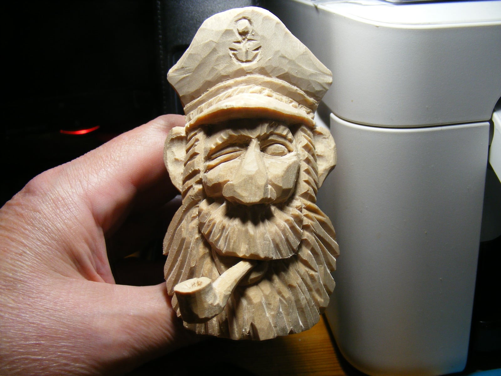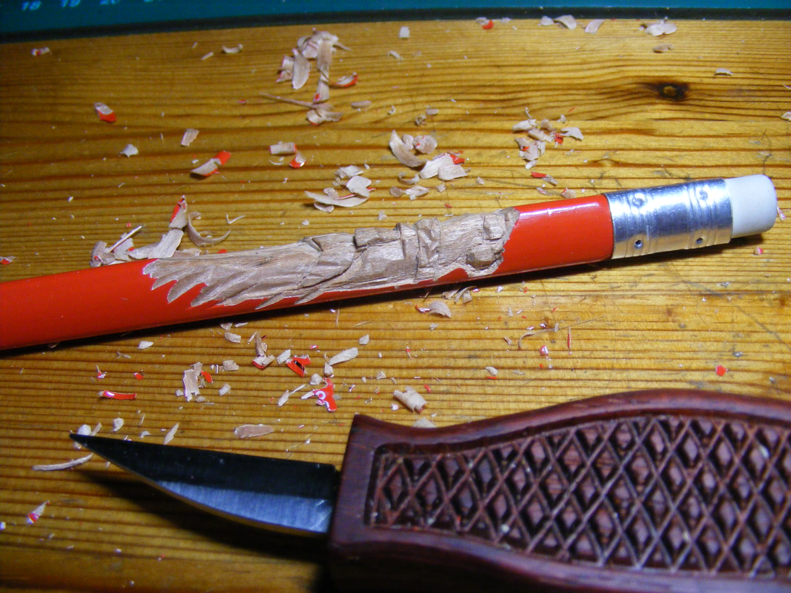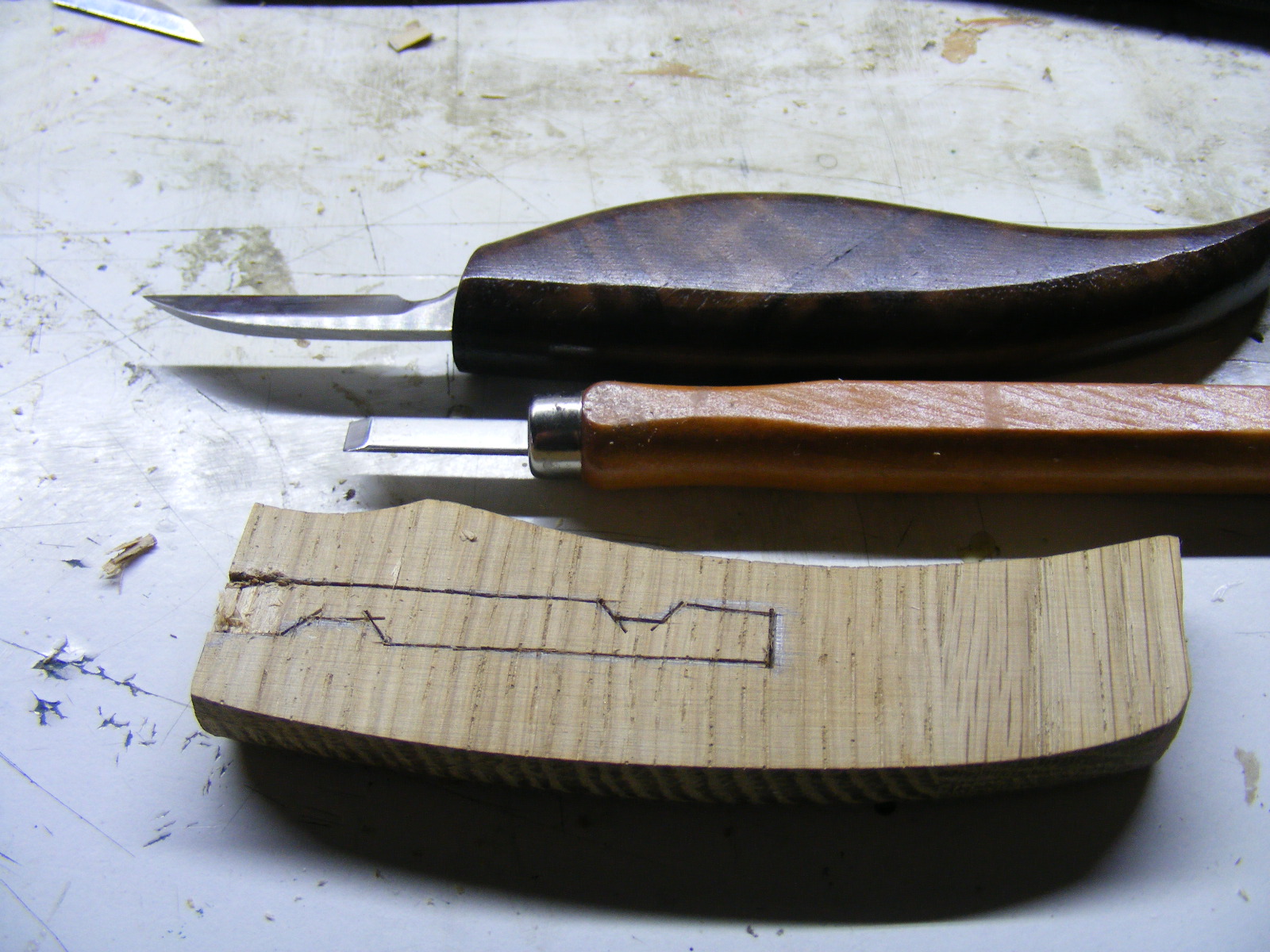 A legelső faragásokat még tapétavágóval, sniccerrel végeztem, de ehhez ez az eszköz finoman szólva sem megfelelő, nem túl erős a pengéje, hajlik, a nyél a kezet is vágja, de az első manómat csak sikerült elkészítenem vele fenyőfából
