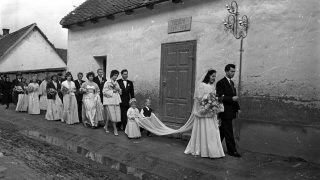 A gyűjteményben találtunk városi, nagypolgári és falusi esküvős képeket, esküvői szekeret, udvari tollfosztást és egy propaganda esküvőt is, ahol egyszerre 7 dolgozó pár kelt frigyre.