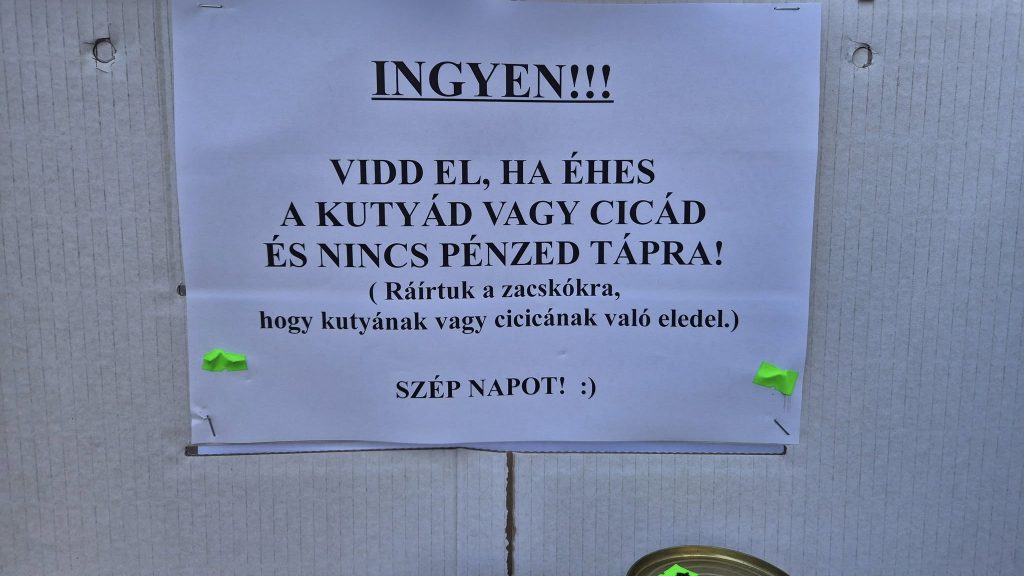 Tavaly májusban nyitott Nyergesújfalun kis családi vállalkozásként a Kutyafaloda nevű állateledel kereskedés, amelynek tulajdonosa és üzemeltetője úgy döntött, hogy a szegényebb, nehezebb helyzetben élő állattartókon úgy segít, hogy ingyenesen elvihető kutya- és macskaeledelt helyez ki az üzletük elé felállított standon.