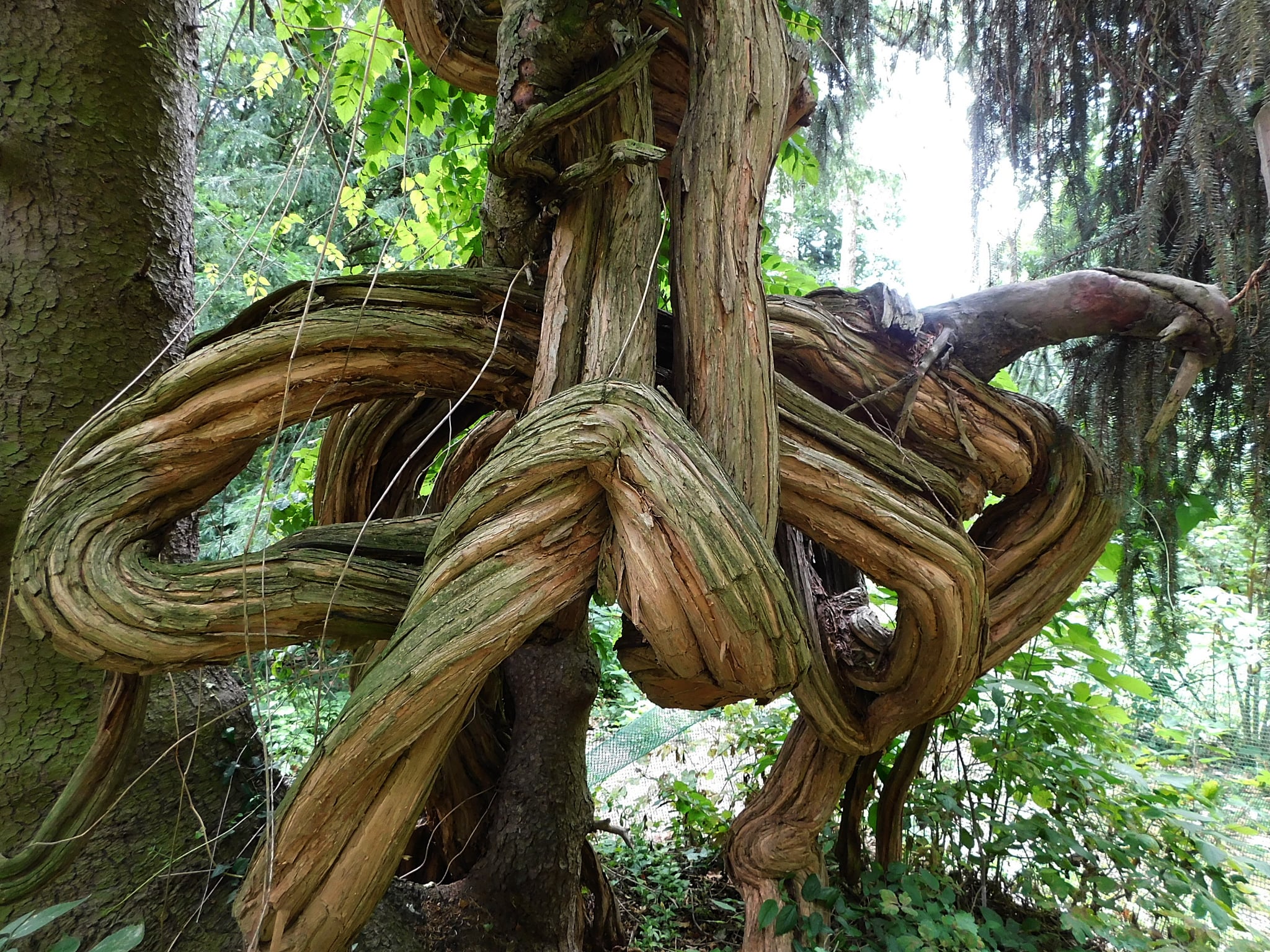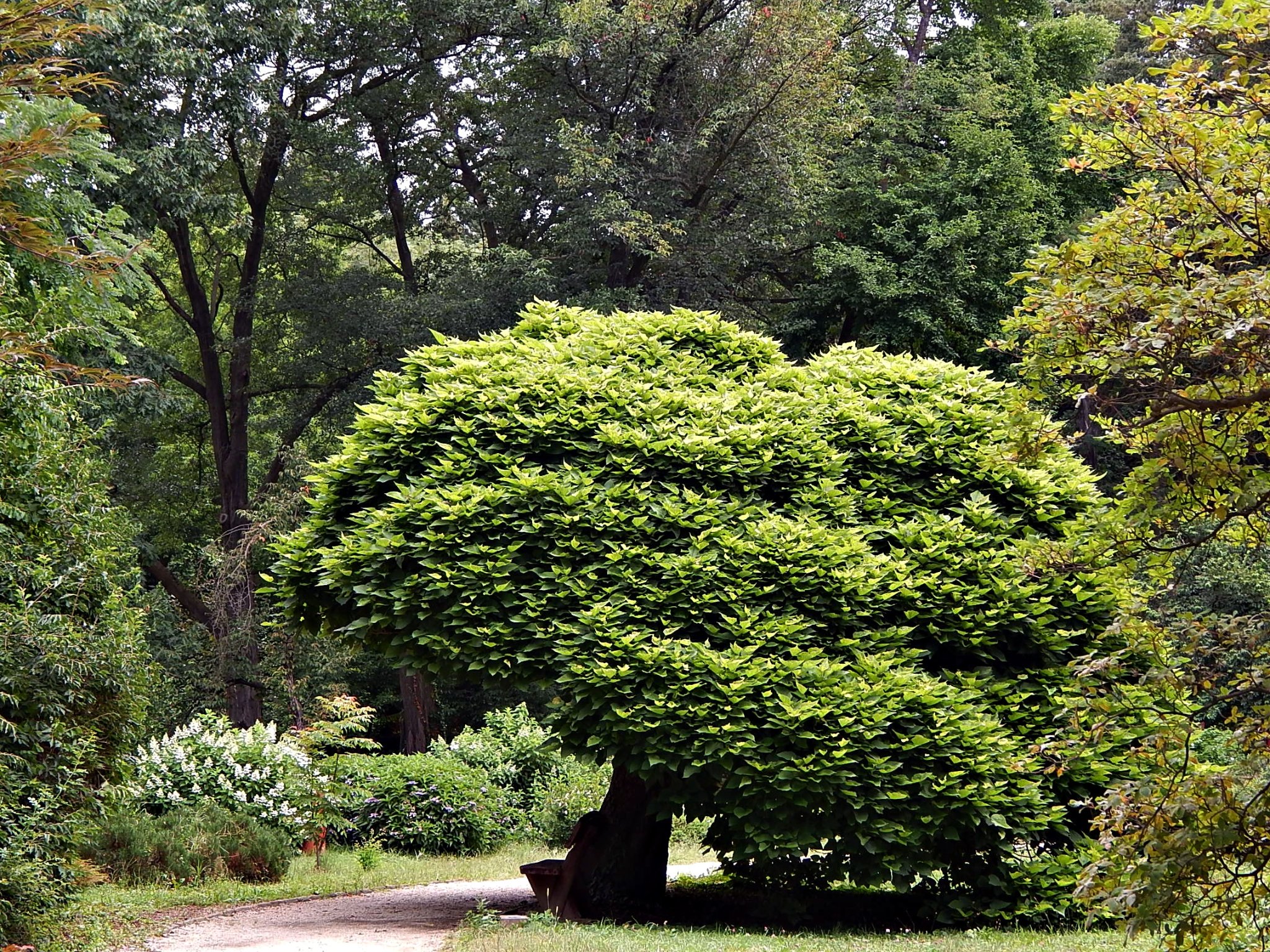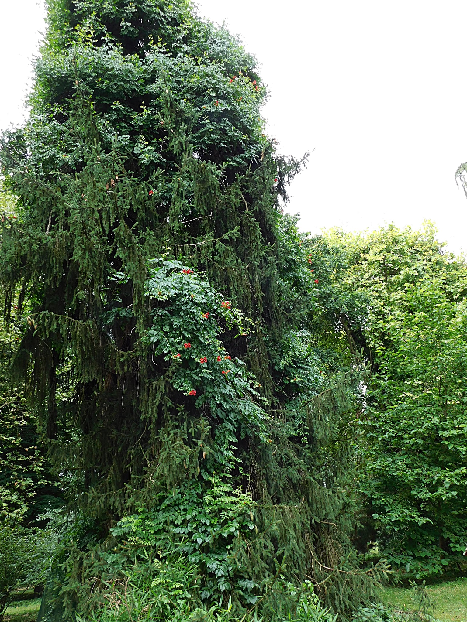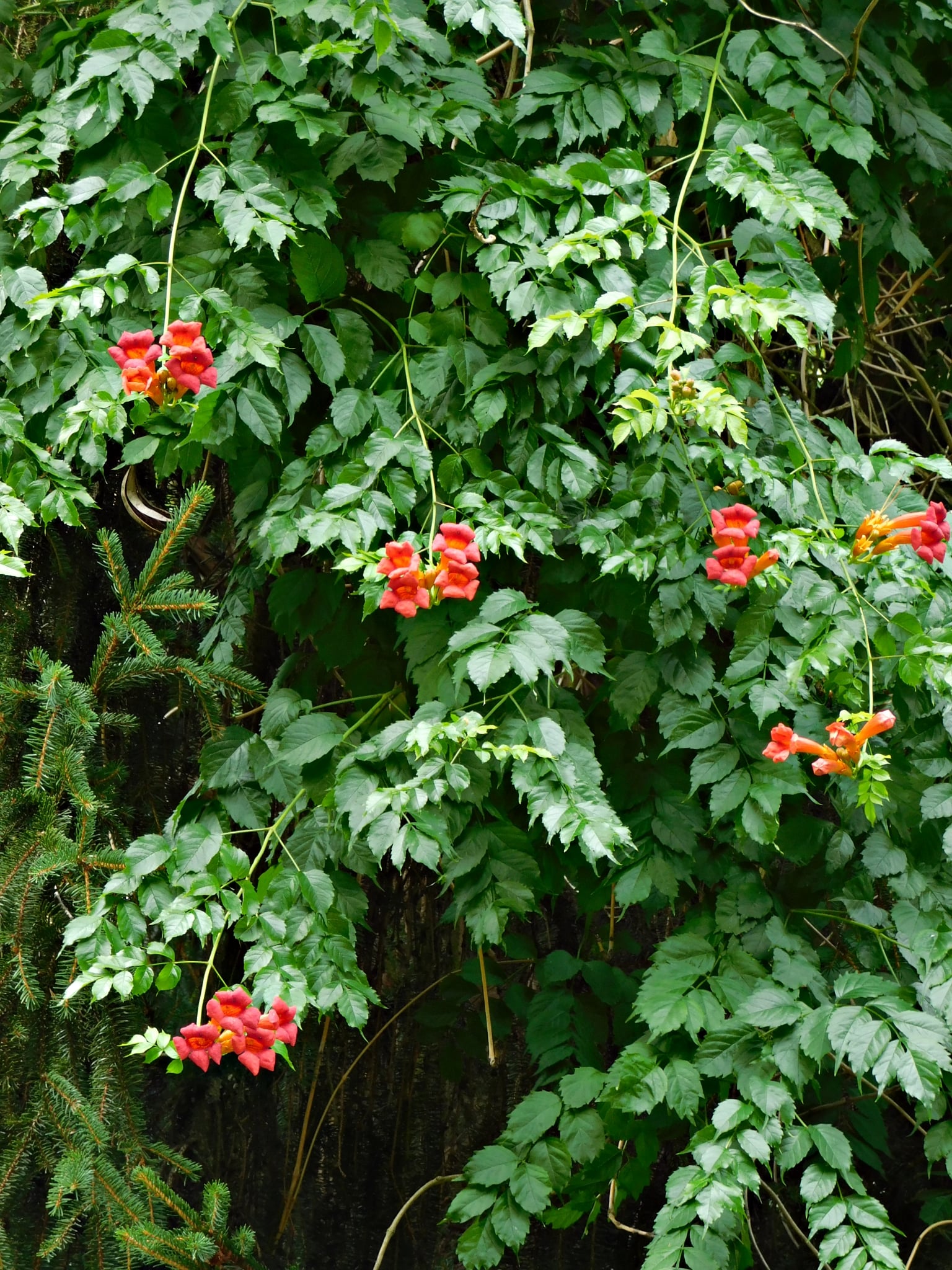 Az arborétum egyik legkülönlegesebb dísze egy termetes trombitafolyondár (Campsis), melynek ágai hatalmas karokként ölelkeznek. A látványos növényt Magyarország egyik legidősebb trombitafolyondárjaként jegyzik. Marcsitól erről is kaptunk néhány szép felvételt.