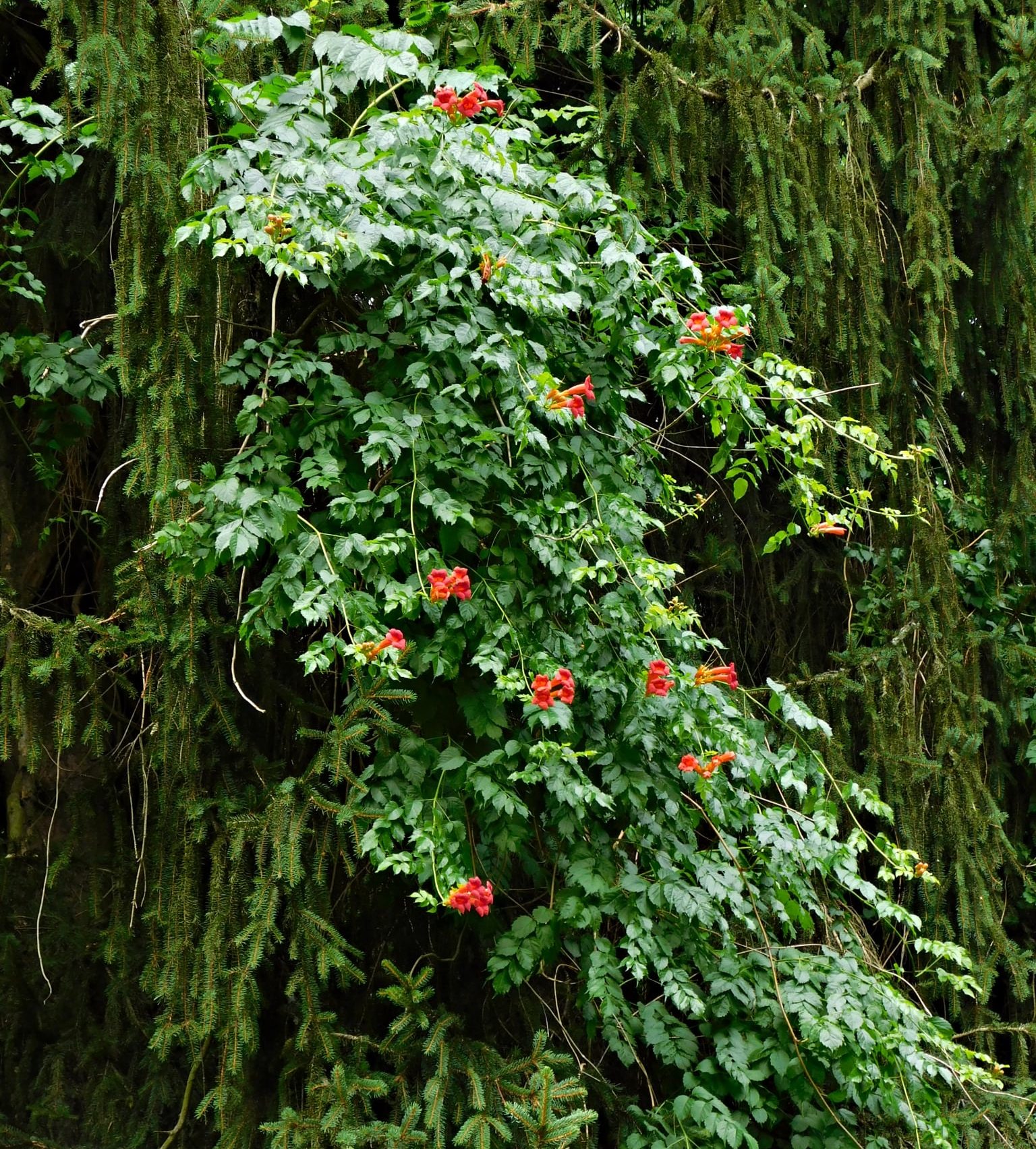 Az arborétum egyik legkülönlegesebb dísze egy termetes trombitafolyondár (Campsis), melynek ágai hatalmas karokként ölelkeznek. A látványos növényt Magyarország egyik legidősebb trombitafolyondárjaként jegyzik. Marcsitól erről is kaptunk néhány szép felvételt.