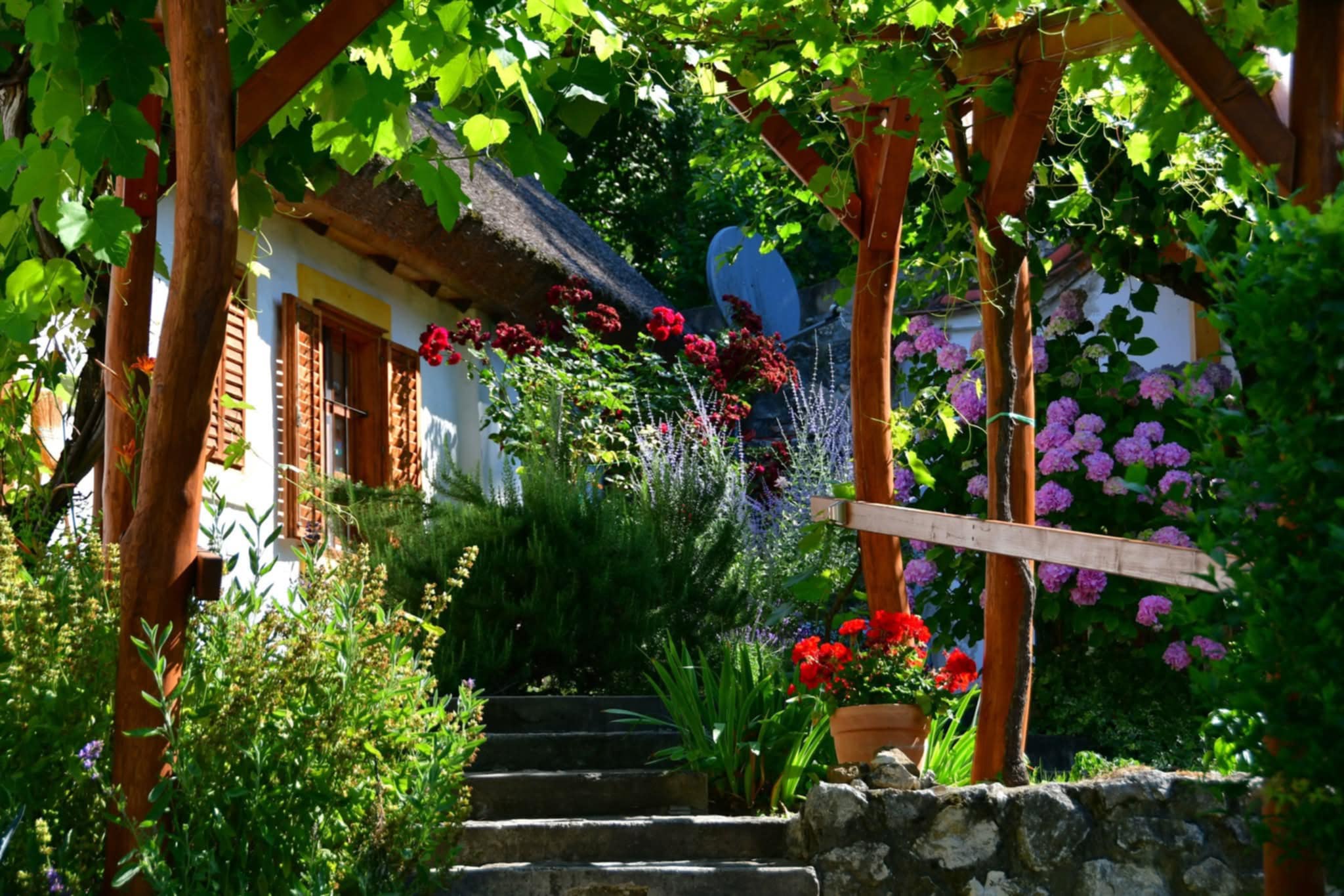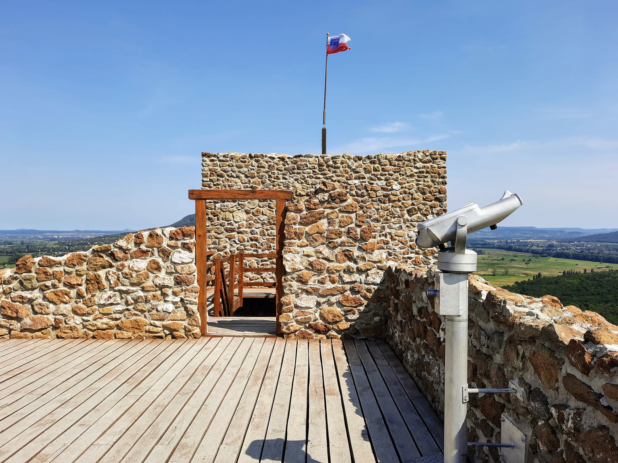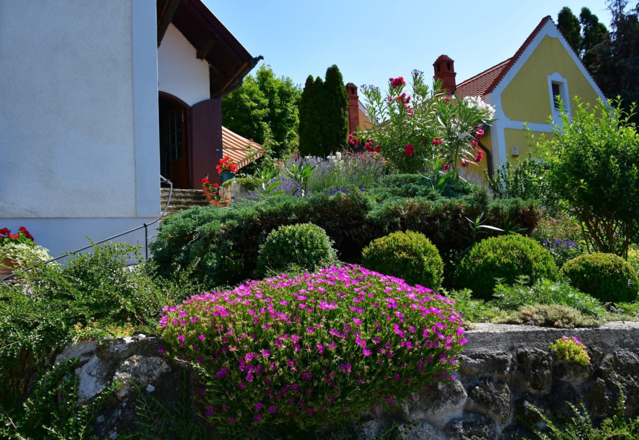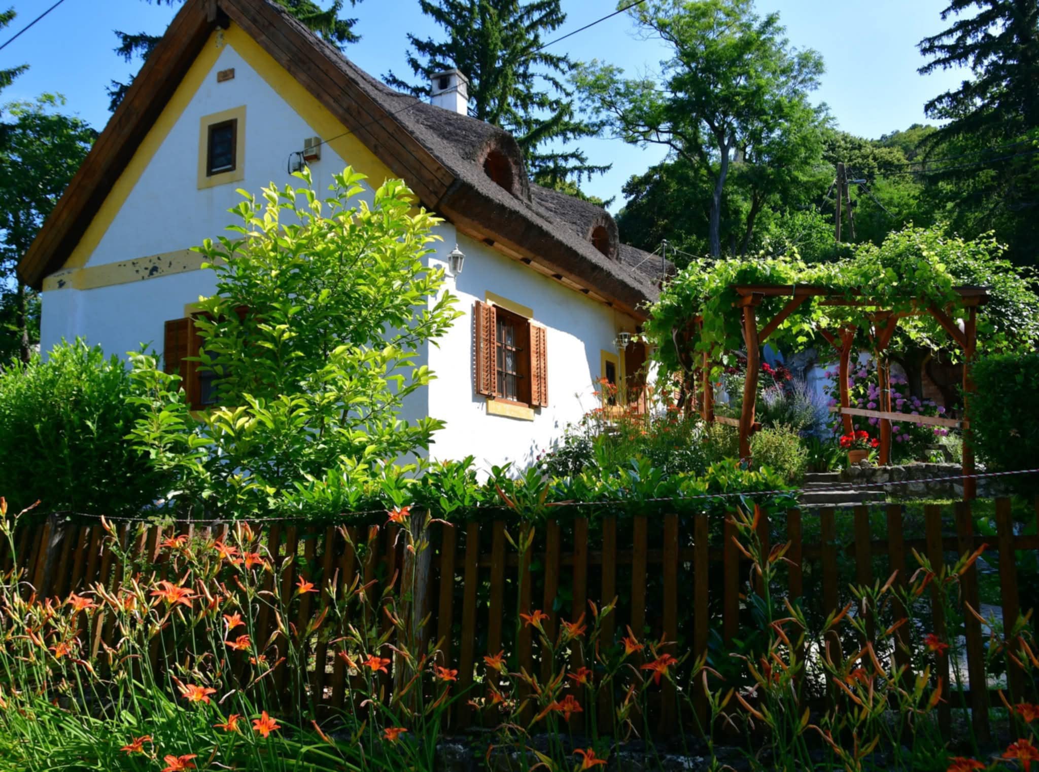 A vár oldalán szőlőskertek futnak, tavasszal pedig virágba borulnak a gyümölcsösök.