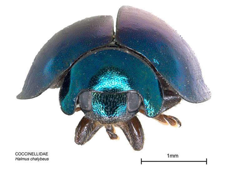 A 19. század végén betelepítették Új-Zélandra is, hogy segítségével visszaszorítsák a citrusfákat pusztító fekete pajzstetvet és az eukaliptuszokat károsító kéregpajzstetveket. A kísérlet sikeresnek bizonyult: a kékacél katica gyorsan otthonra talált, és ma már gyakori rovarnak számít Új-Zéland északi vidékein is.