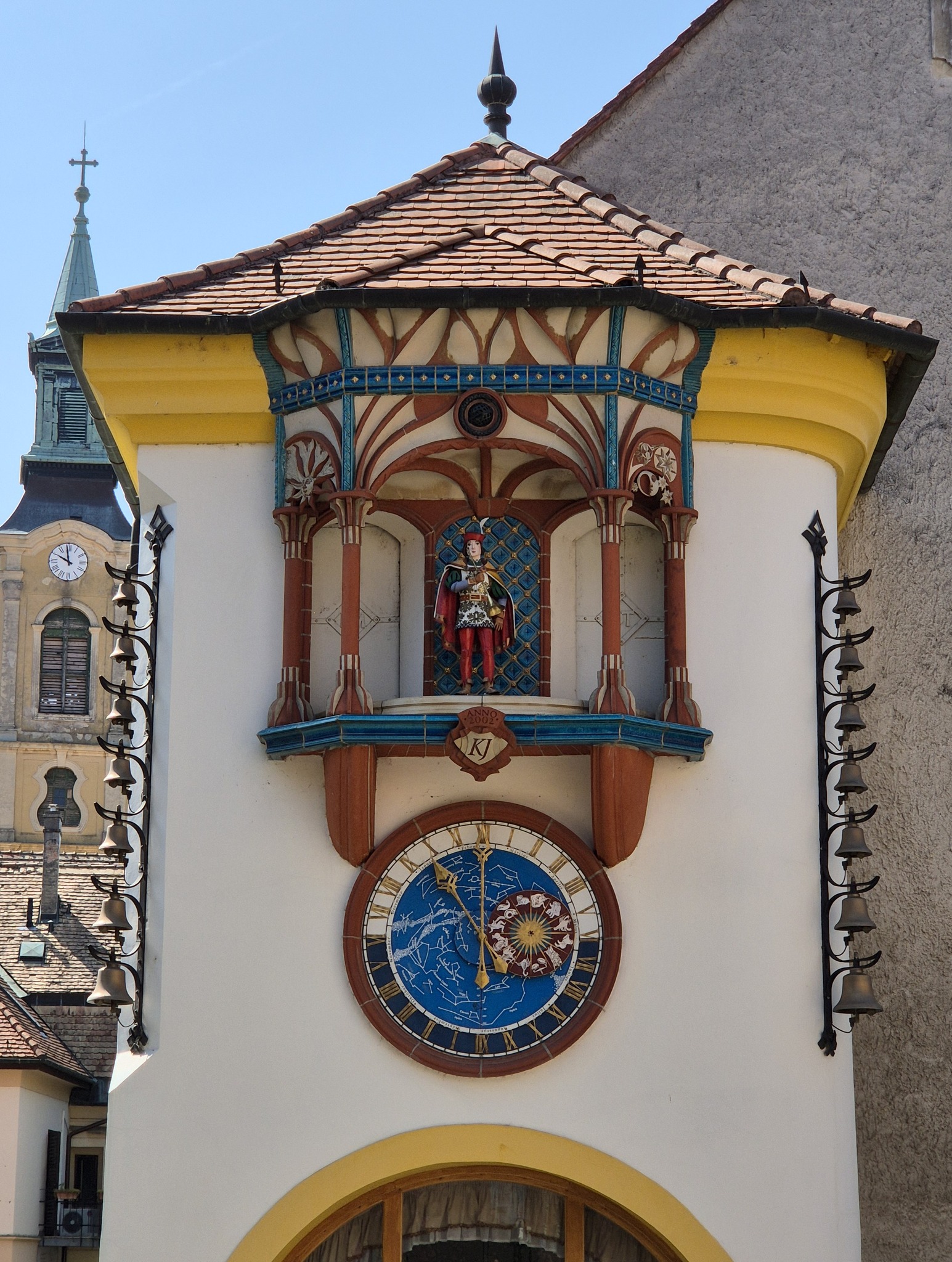 Ez a különleges, történelmi tematikájú óra 2002-ben több művész közreműködésével készült el, egy több mint 200 éves belvárosi épület homlokzatára.