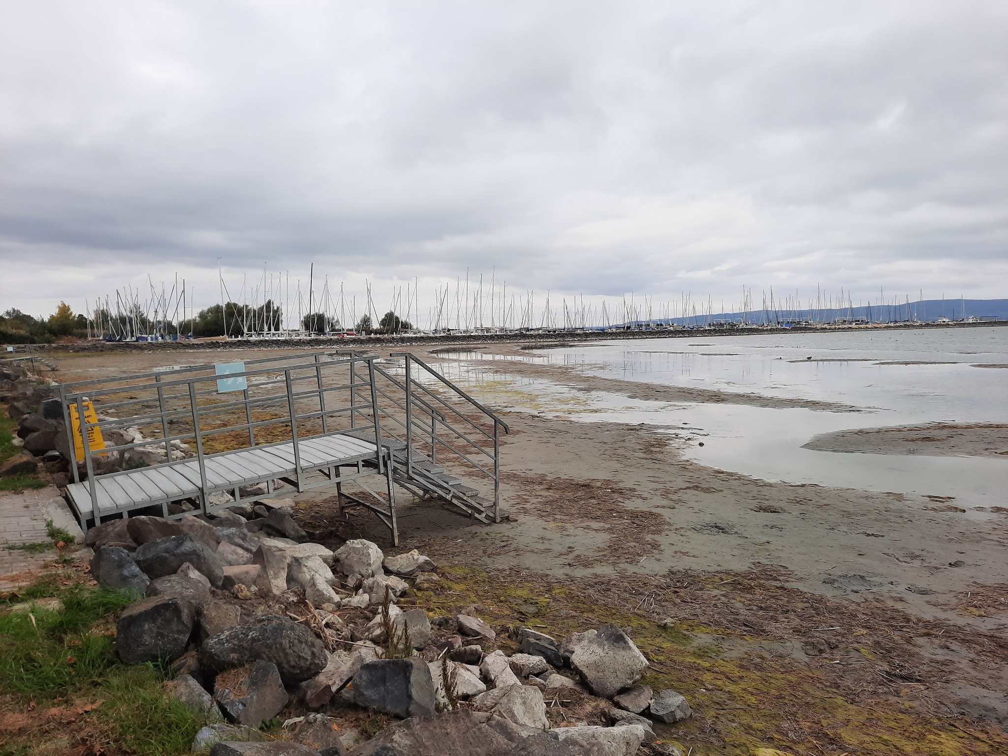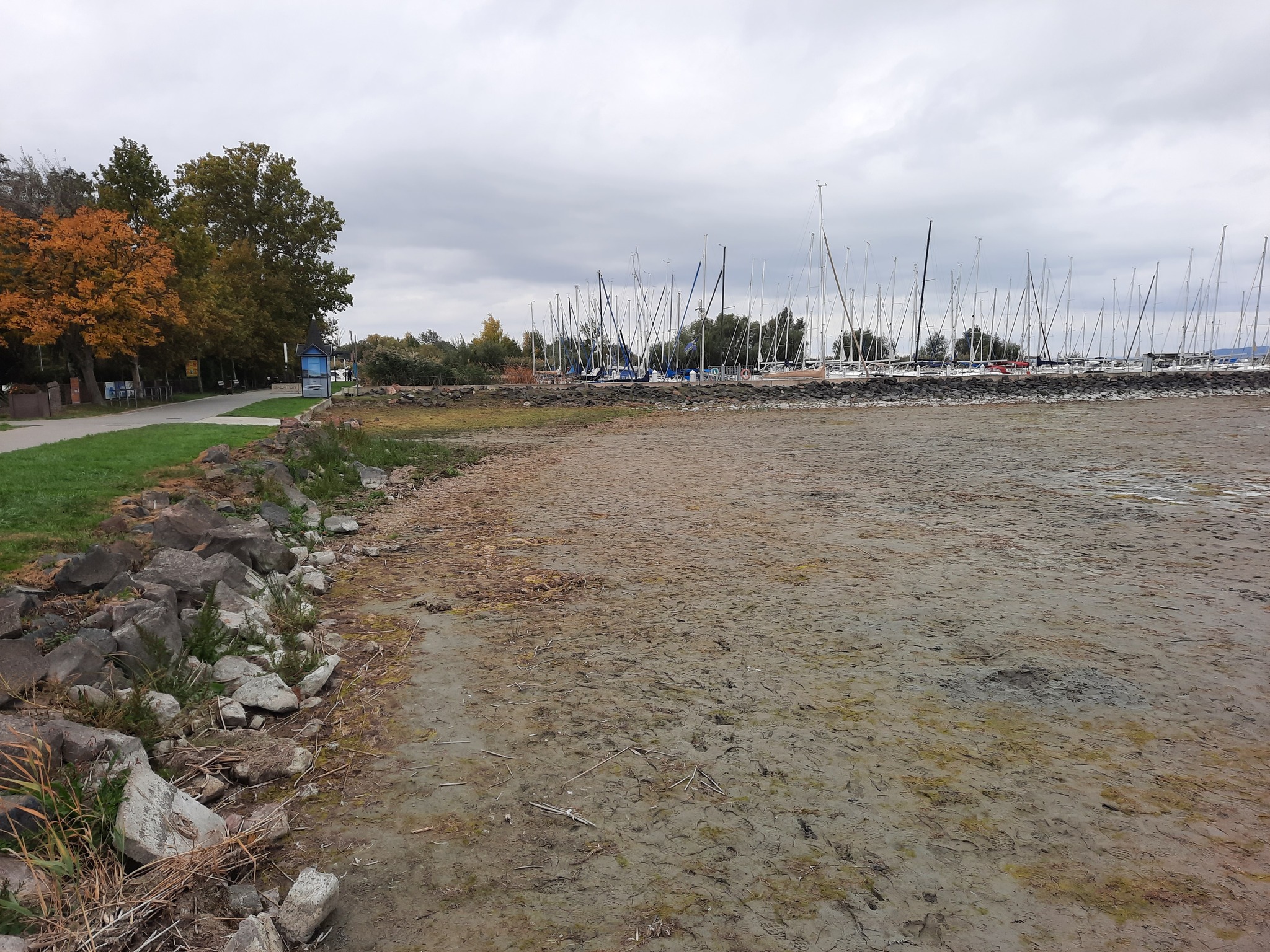 A tó déli partjainál száraz lábbal jócskán be lehet sétálni a mederbe anélkül, hogy víz érne minket.