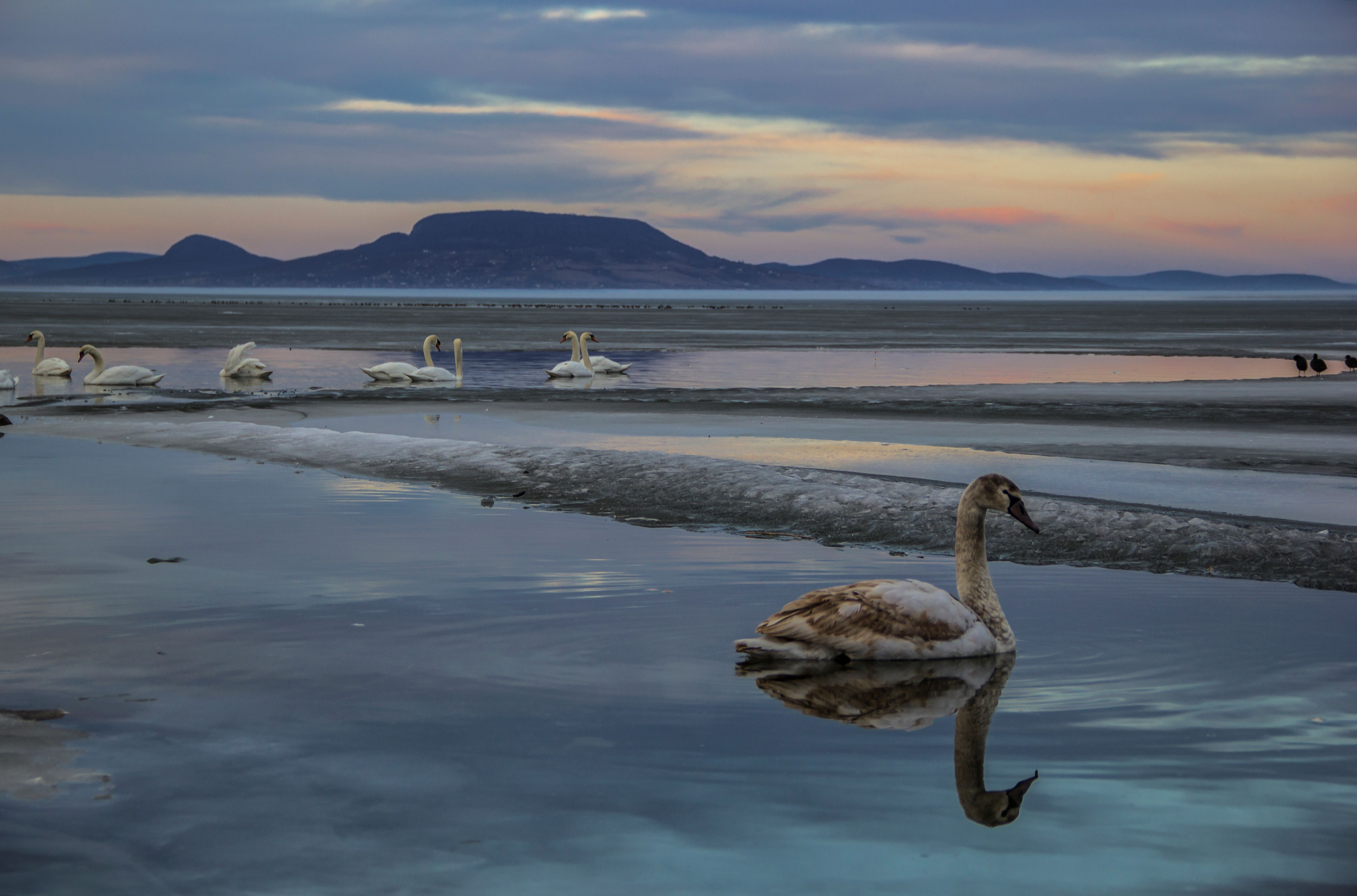 A februári hónap képe az olvadó jégtáblák között úszó hattyúkkal Balatonmárián készült, a márciusi hónap fotóján lakóhelye, Kővágóörs látható, ahogy a Badacsony mögül még egy utolsó pillantást vet a lenyugvó Nap.