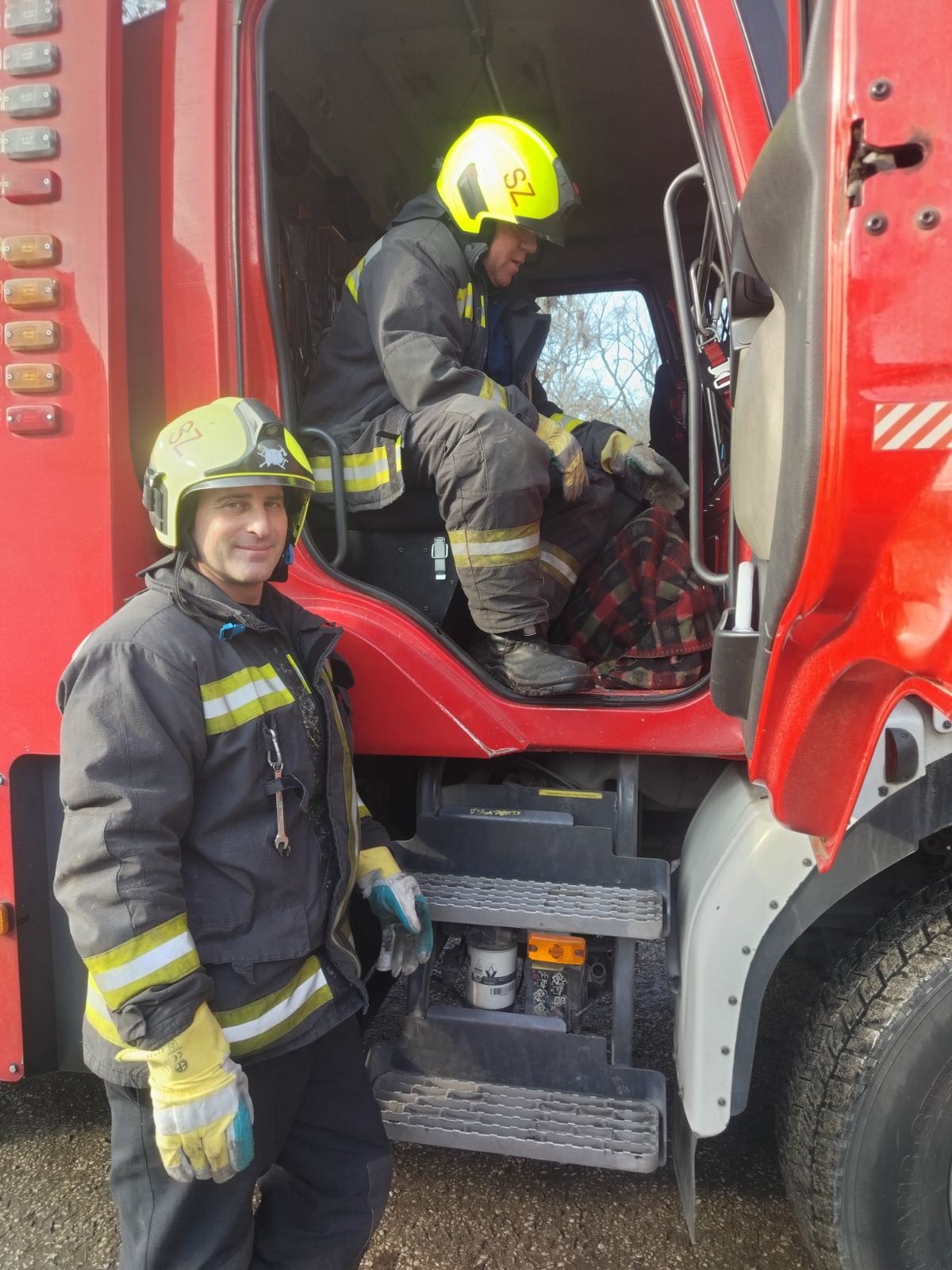 Meleg plédbe burkolva, sok szeretettel körbevéve utazhatott a tűzoltóautóban.