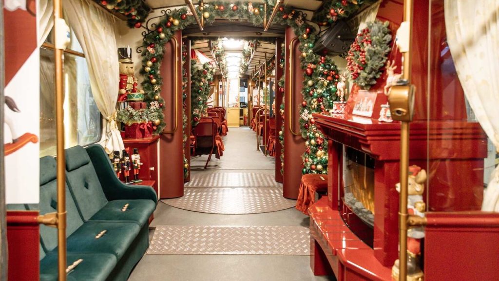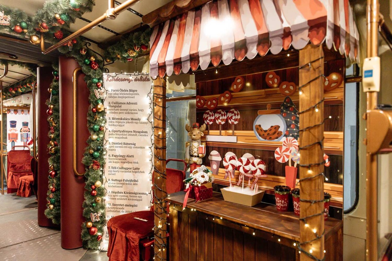 A külső elegancia az utastérben is folytatódik. A sötétzöld és bordó színek dominanciája, a gazdagon díszített girlandok, a kézzel kidolgozott fa Diótörő figurák és hintalovak meghitt, vásári hangulatot teremtenek. A karácsonyi miliőt tovább erősítik a gúla alakú díszfenyők, a forró csokoládé illatát idéző fa pavilon és a kandalló motívuma, amelyek együtt egy szívmelengető, ünnepi utazás élményét kínálják.