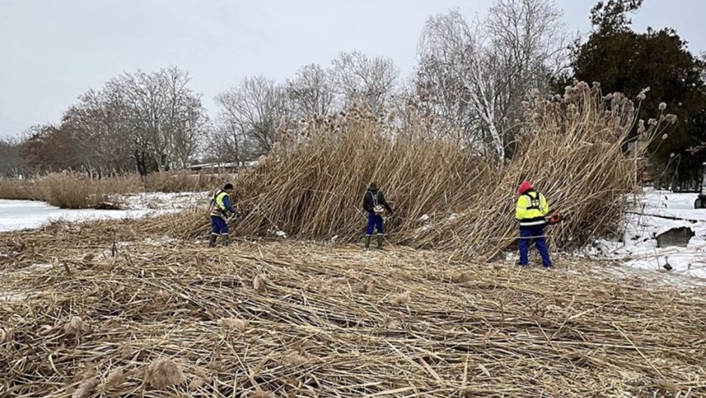 Bízunk benne, hogy az időjárás lehetőséget ad számunkra, hogy még pár napig folytassuk a munkálatokat. Az Esterházy strand és a Kisfaludy strand keleti illetve nyugati lido részénél vágjuk a nádast, az Aranyhíd strandnál is dolgozunk. A szakhatósági előírás szerint a jég fölött tíz centiméterrel vágjuk el a nádat