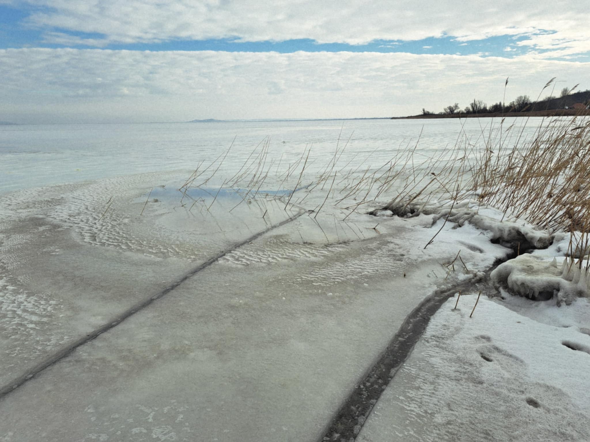 Kemény mínuszok jellemezték a múlt hetet, amiben szépen hízott a Balaton jege. A déli parton összefüggő jég alakult ki, de még nem volt elég vastag ahhoz, hogy biztonságosan rálépjünk, korcsolyázzunk rajta. Hosszan elnyúló repedések, azaz rianások látszódtak a part mentén, a hét közepén pedig egy hatalmas rianásról számoltunk be a partra merőlegesen.