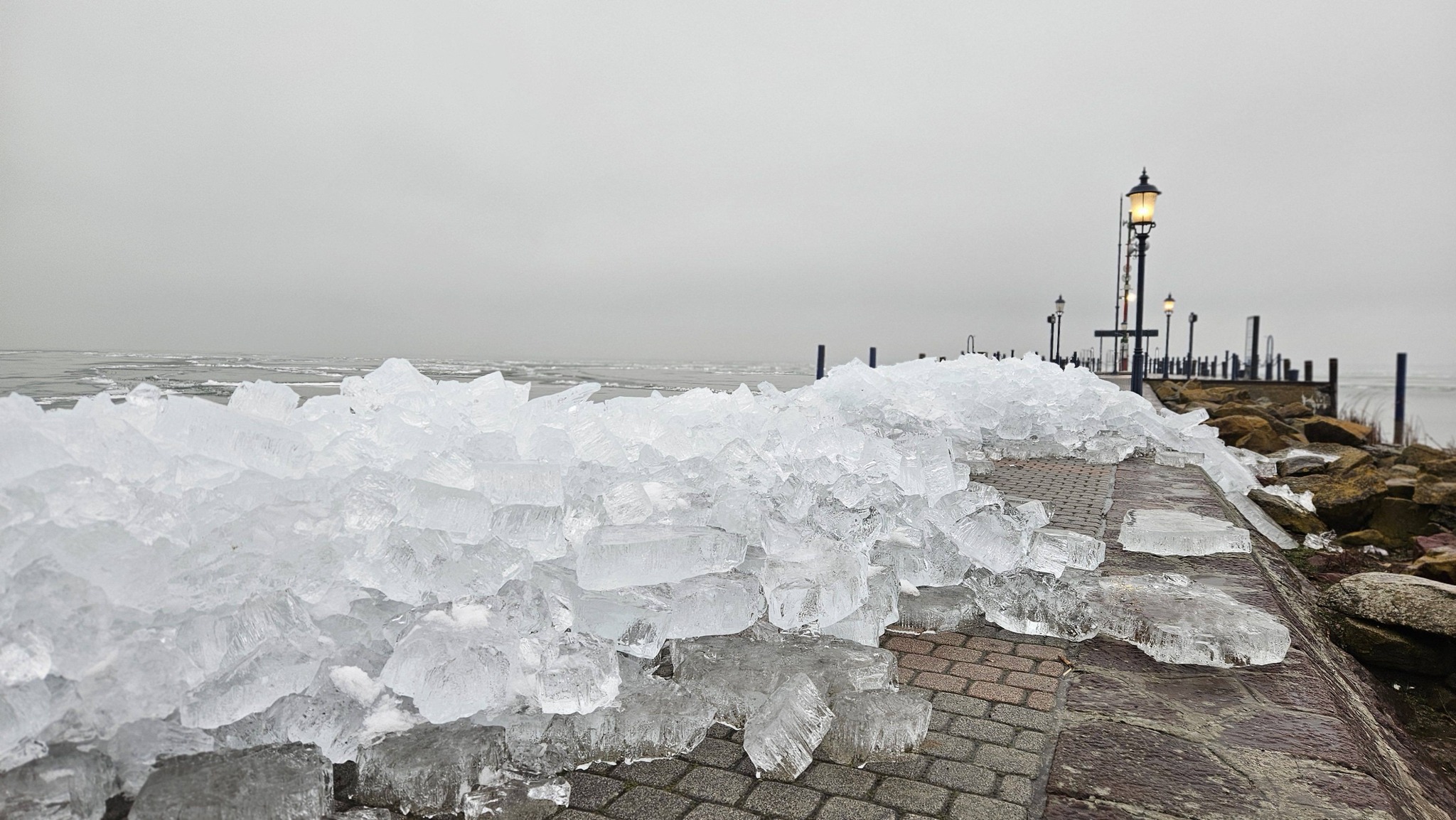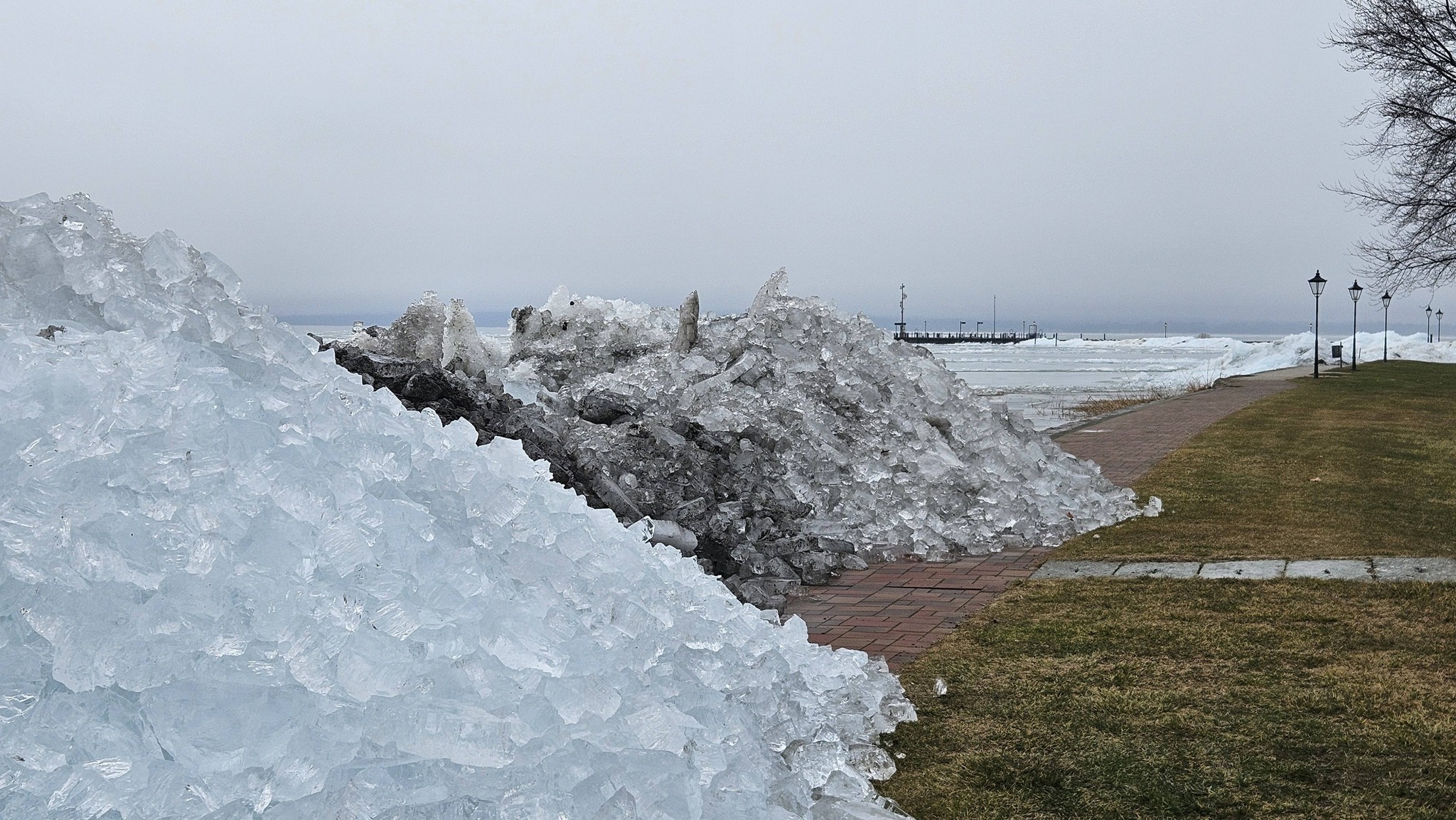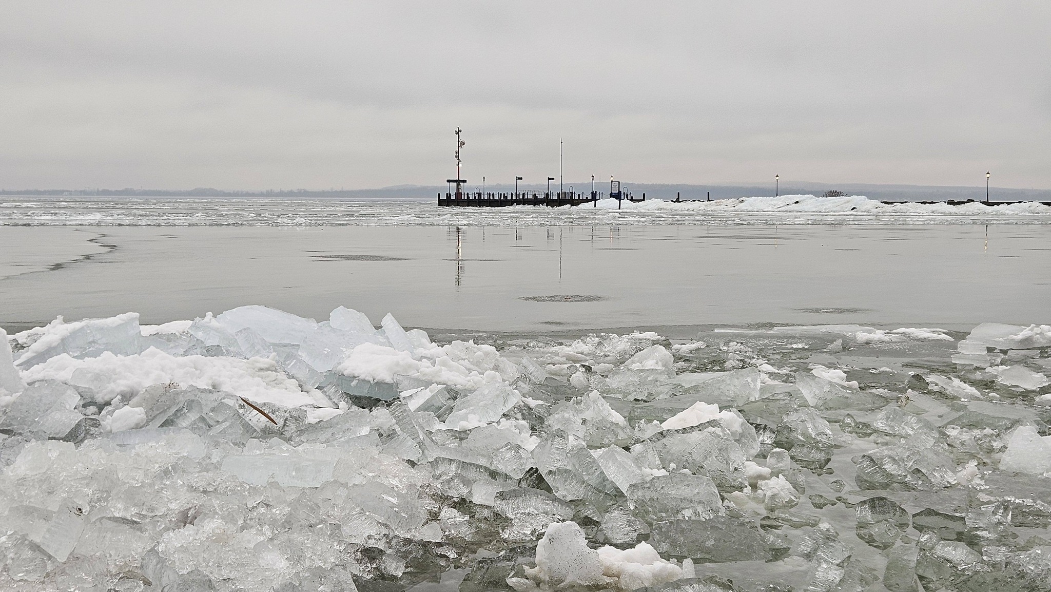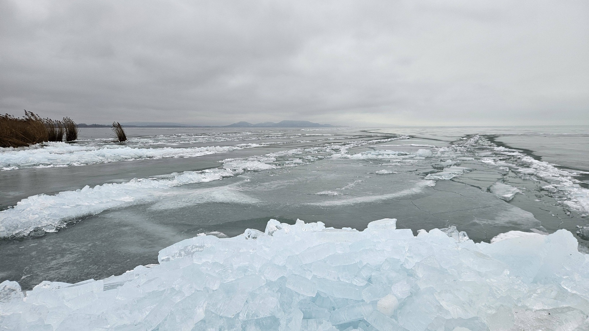 Az enyhébb idő beköszöntével elkezdődött az olvadás, ám a magyar tenger felszínét többfelé még mindig vékony jégréteg borítja. Az olvadó, töredezett jég a szél és a víz mozgásának eredményeként néhány helyen a tó partáig sodródott, és ott hatalmas kupacokban formázott miniatűr jéghegyeket.