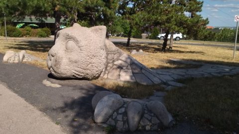 Szó szerint fekszik, lapul és az utcán sétálók felé néz, mint aki épp ugrani készül. Az alkotás címe is erre utal: "játszó macska", aki már több mint 40 éve csal mosolyt az arra járók arcára.
